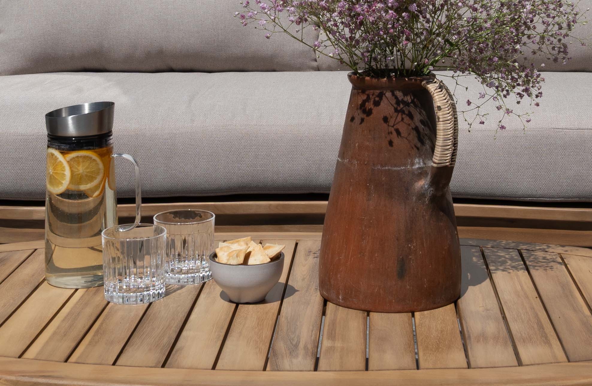De dikke loungekussens in een prachtige zandkleur hebben zachte, afgeronde hoeken en volgen de organische lijnen van de bank en loungestoelen, wat zorgt voor een harmonieuze en unieke uitstraling. De set bevat een ruime 2-zits loungebank, twee comfortabele loungestoelen, en een bijpassende ovale lage loungetafel van acaciahout – ideaal voor een kopje koffie of een goed boek. Met de Cancun loungeset creëer je moeiteloos een warme, rustgevende buitenruimte waar je kunt genieten van het buitenleven in stijl en comfort.