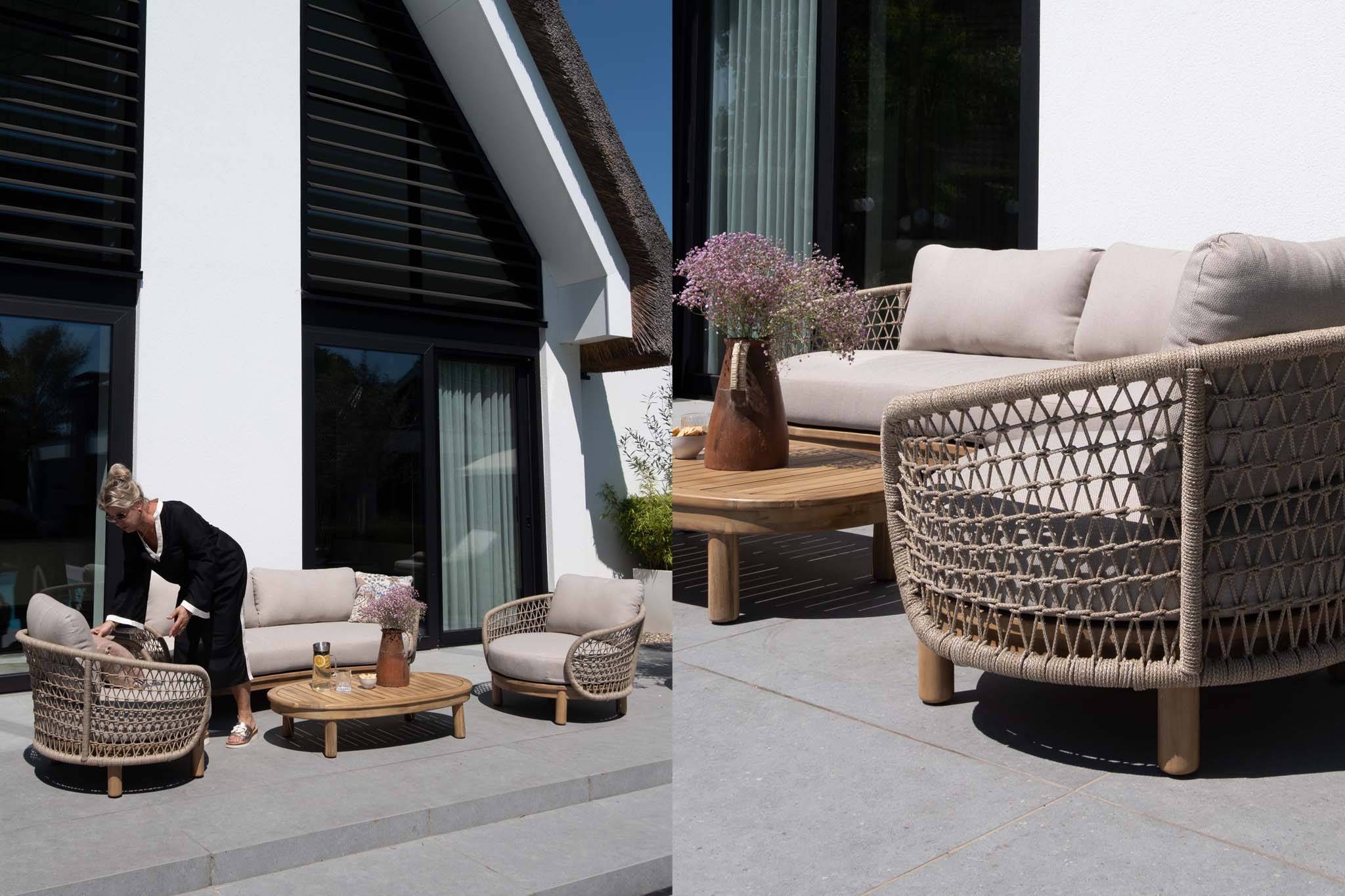 De dikke kussens in de verfijnde kleur Sand zorgen voor optimaal comfort en versterken de warme en luxe uitstraling van de set. Of je nu ontspant met een boek of geniet van een avond met vrienden, deze loungeset biedt de perfecte balans tussen comfort en stijl. De bijpassende lage ovale loungetafel is niet alleen praktisch voor het plaatsen van drankjes en hapjes, maar sluit ook perfect aan bij het organische design van de set.