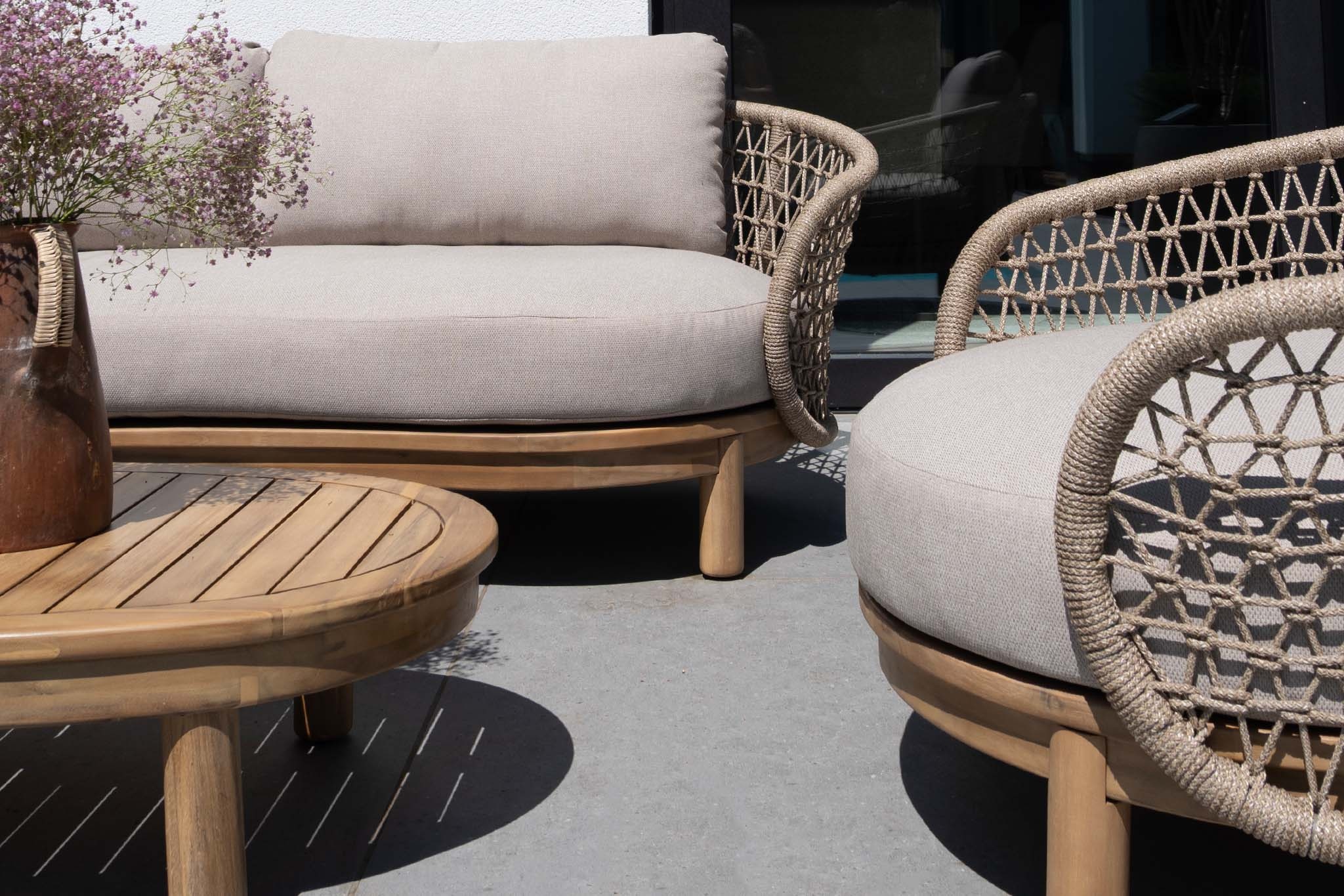 De Maka loungeset combineert organische vormen met luxe materialen voor een stijlvol en uitnodigend buitenmeubel. Deze set, bestaande uit een ruime 3-zits loungebank, twee royale loungestoelen met ronde zitting en een praktische ovale loungetafel, is de perfecte keuze voor een comfortabele en stijlvolle buitenruimte. Het frame van de loungeset heeft een warme teaklook afwerking, die perfect samengaat met het rope in een elegant kruispatroon. Deze combinatie geeft de set een design uitstraling, terwijl het natuurlijke karakter behouden blijft. De ronde vormen van de stoelen en bank voegen een speelse, organische touch toe aan het geheel.