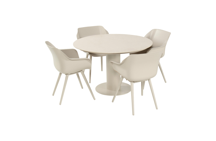 Een rustige, neutrale dining set voor vier personen. De ronde Girona tuintafel van 120 cm in Sand gecombineerd met vier Sophie tuinstoelen in dezelfde kleur. Licht van uitstraling en geschikt voor terrassen waar je geen zware materialen wilt.