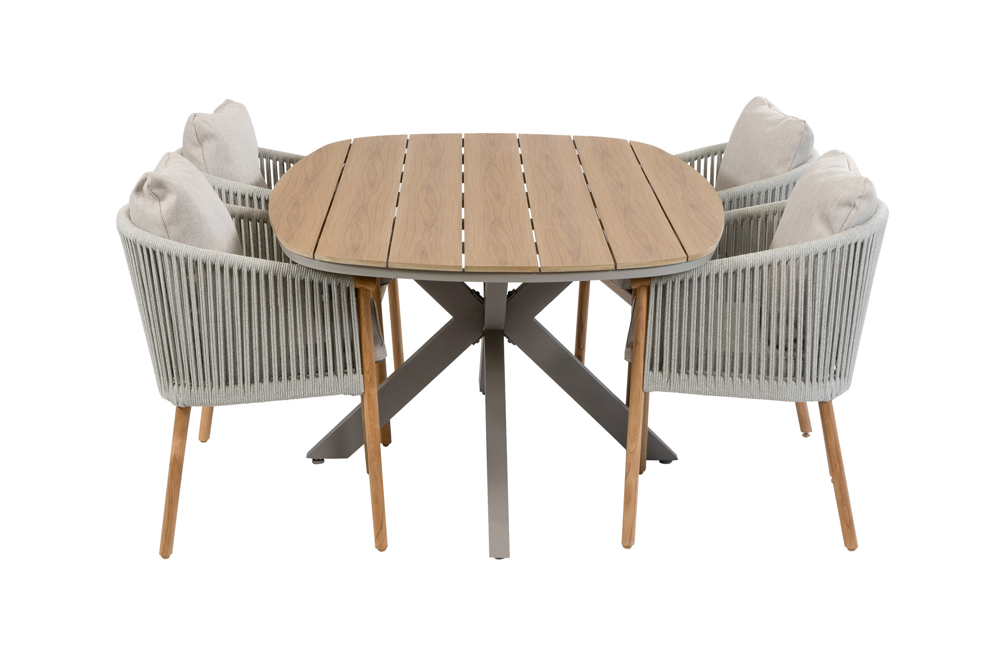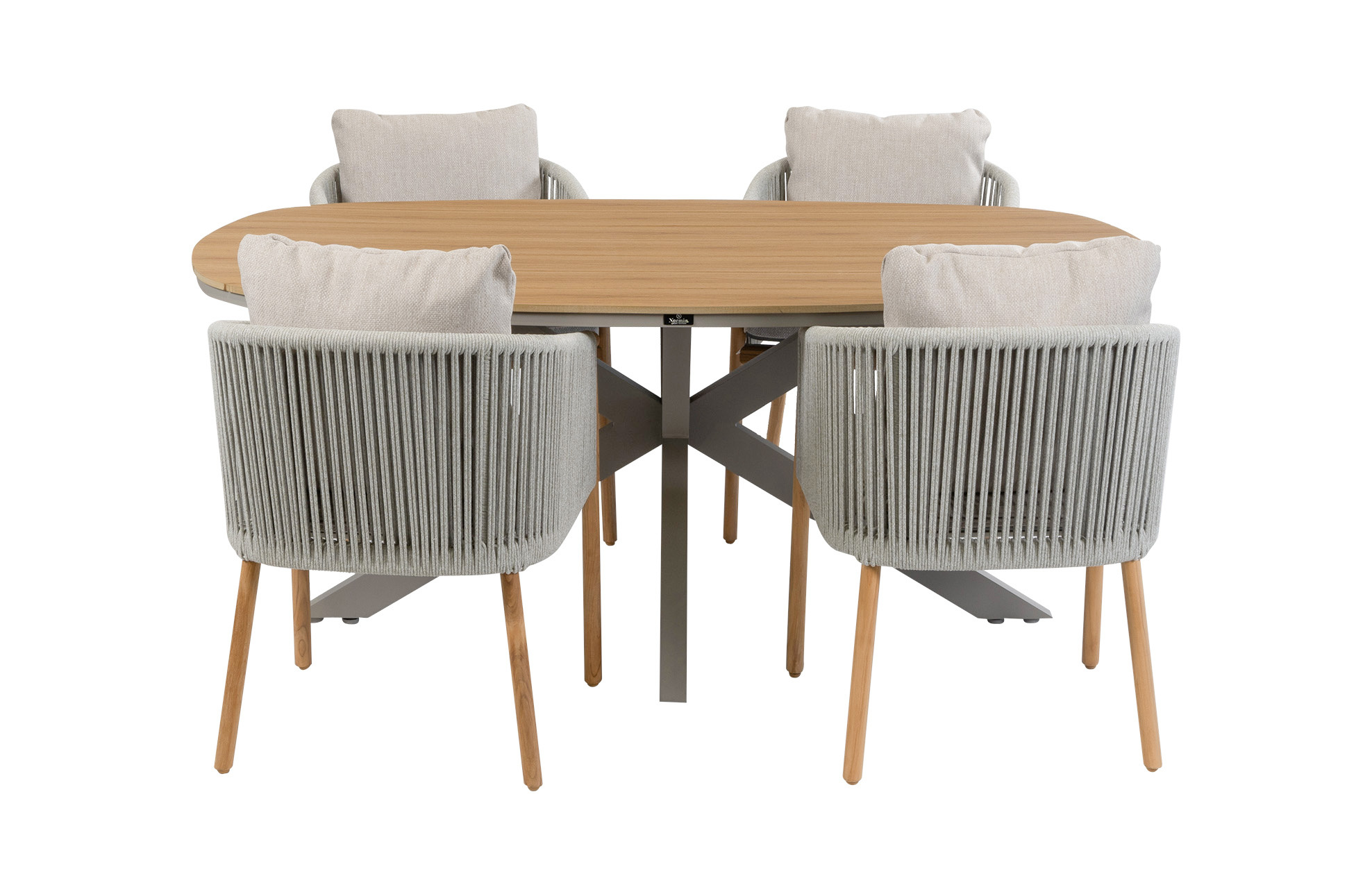 Op zoek naar een comfortabele en stijlvolle tuinset? De 5-delige tuinset combineert modern design met natuurlijke materialen, perfect passend bij elke buitenruimte. Gemaakt van duurzaam teakhout en bespannen met weerbestendig rope in een elegante lichtgrijze tint, biedt deze set niet alleen een luxe uitstraling maar ook uitzonderlijk zitcomfort. De rugleuning van de Es Vedra tuinstoel is gevlochten met flexibel rope dat zich aanpast aan de natuurlijke vorm van je rug, waardoor je optimaal wordt ondersteund tijdens lange diners buiten. Het zit- en rugkussen in de subtiele beige kleur 'Cream' is waterafstotend en biedt extra comfort. We raden aan de tuinkussen droog op te bergen tijdens regenachtige periodes, zodat de levensduur hiermee verlengd wordt.