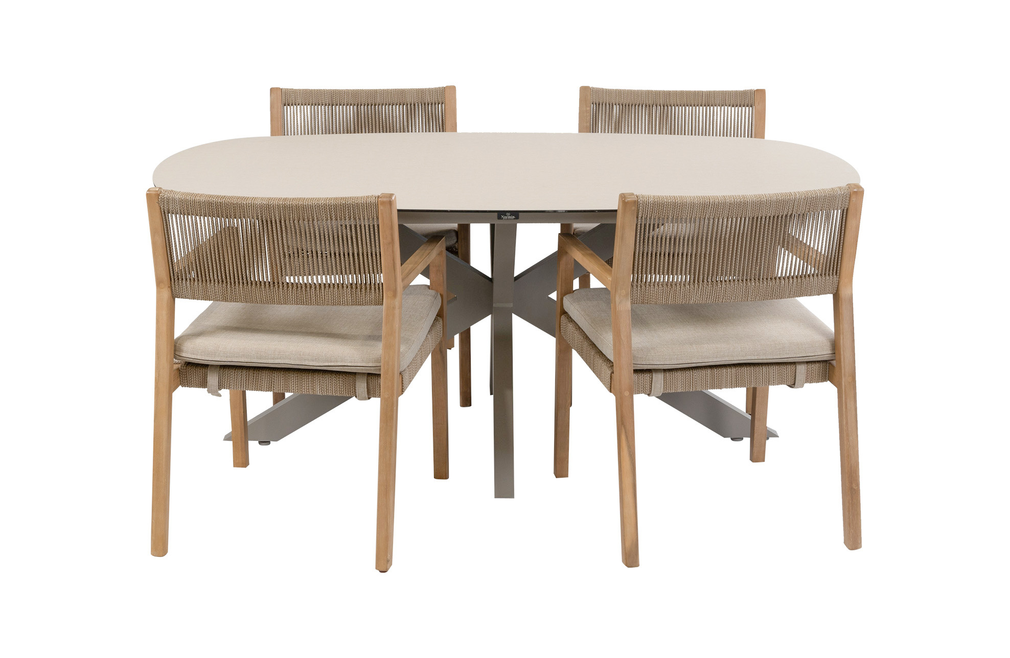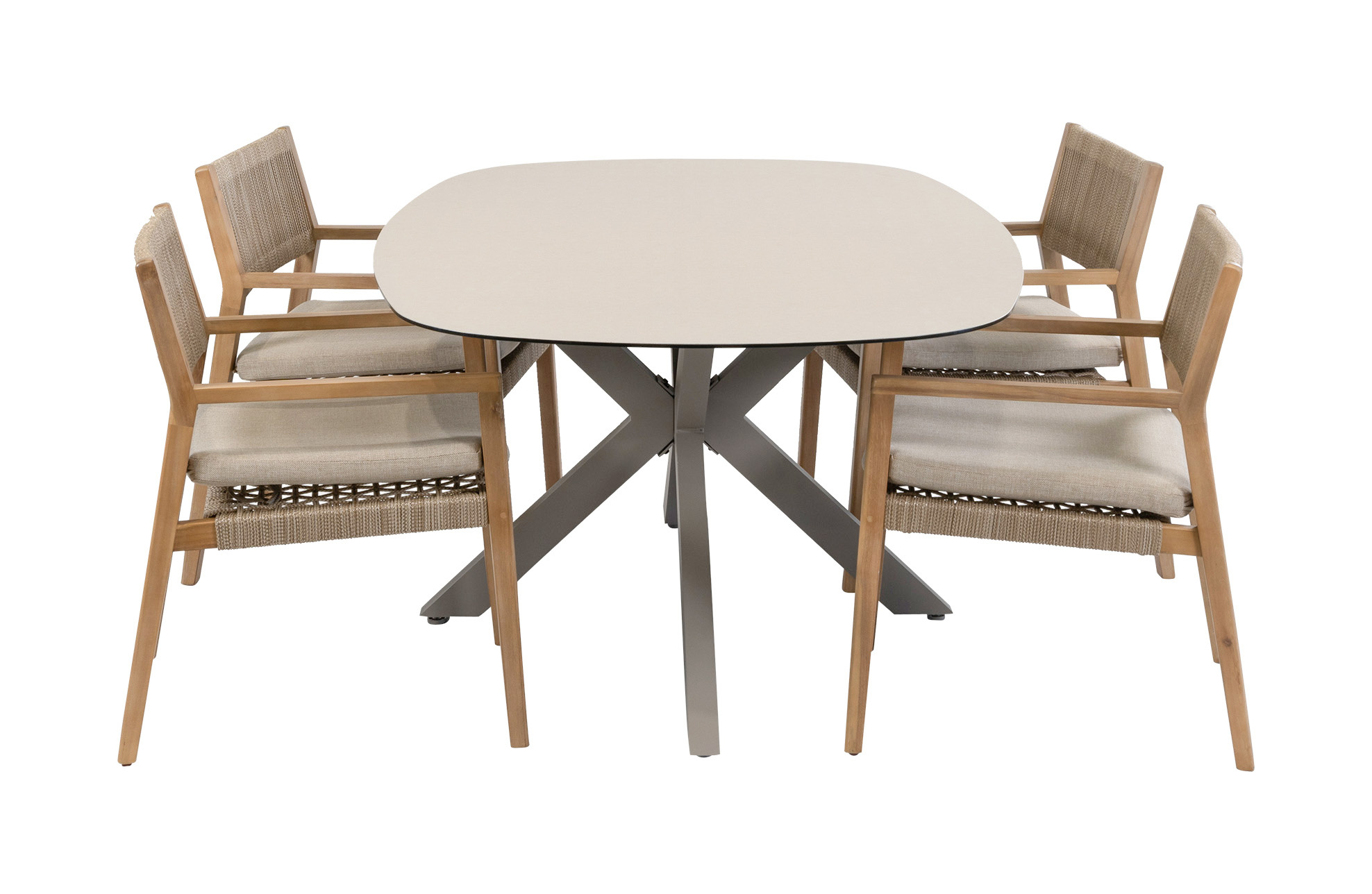 De tuinset is gecombineerd met 4 houten dining tuinstoelen Felline. Dit is een elegante tuinstoel in een natuurlijke stijl. Tuinstoel Felline is gemaakt van Acaciahout. Deze hardhout soort is erg sterk, weersbestendig en duurzaam. Een uniek ontwerp met gevlochten touw bij het zit en ruggedeelte. De tuinstoel word inclusief zitkussen geleverd. Het zitkussen zorgt voor extra voor comfort, mede dankzij een hoge dichtheid van schuimvulling. Een hogere dichtheid geeft een grote duurzaamheid en meer comfort. Het zitkussen is bedekt met olefin stof die aan de binnenkant zijn afgewerkt met een waterafstotende coating. Let op: het zitkussen is dus niet 100% all weather maar kan gerust tegen een regenbui.