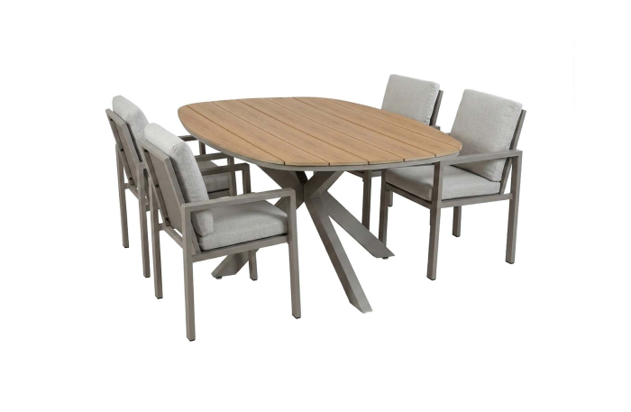 Deze combinatie brengt modern aluminium samen met warm teak. Rechte lijnen tegen een natuurlijke houtstructuur. Functioneel, duurzaam en geschikt voor terrassen waar moderne vormgeving centraal staat.