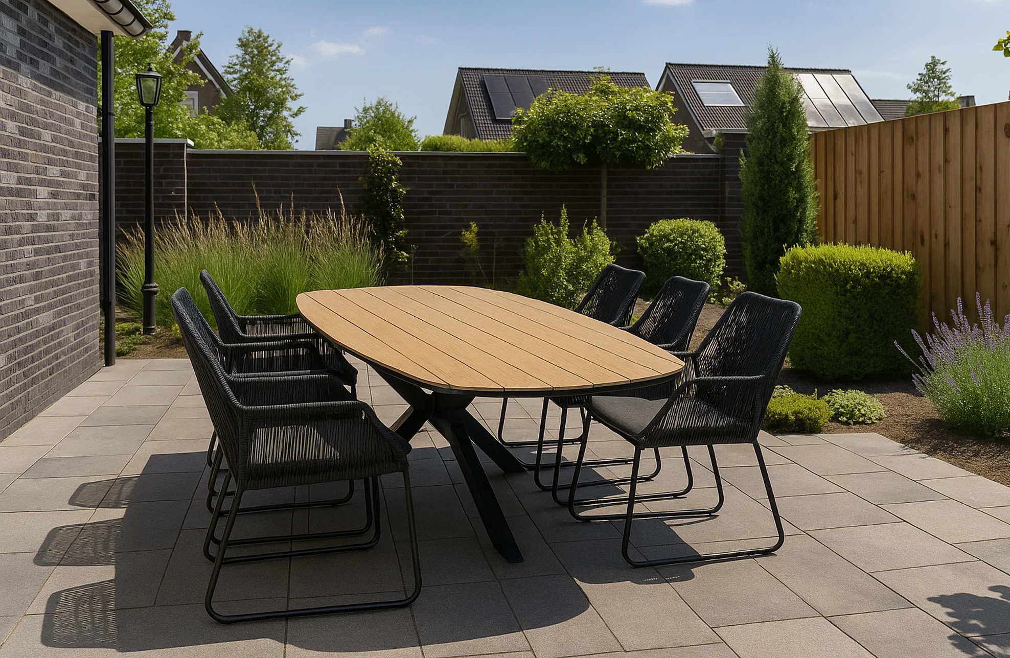 Deze prachtige bootvormige moderne tuintafel is gecombineerd met 4 zwarte Mona tuinstoelen, genoeg ruimte voor een fijn gezelschap. De Mona tuinstoel is bespannen met kunststof rope wat zeer flexibel, sterk en weerbestendig is. Door de flexibiliteit van het rope zal het de rug goed ondersteunen en neemt het de natuurlijke vorm van de rug aan.