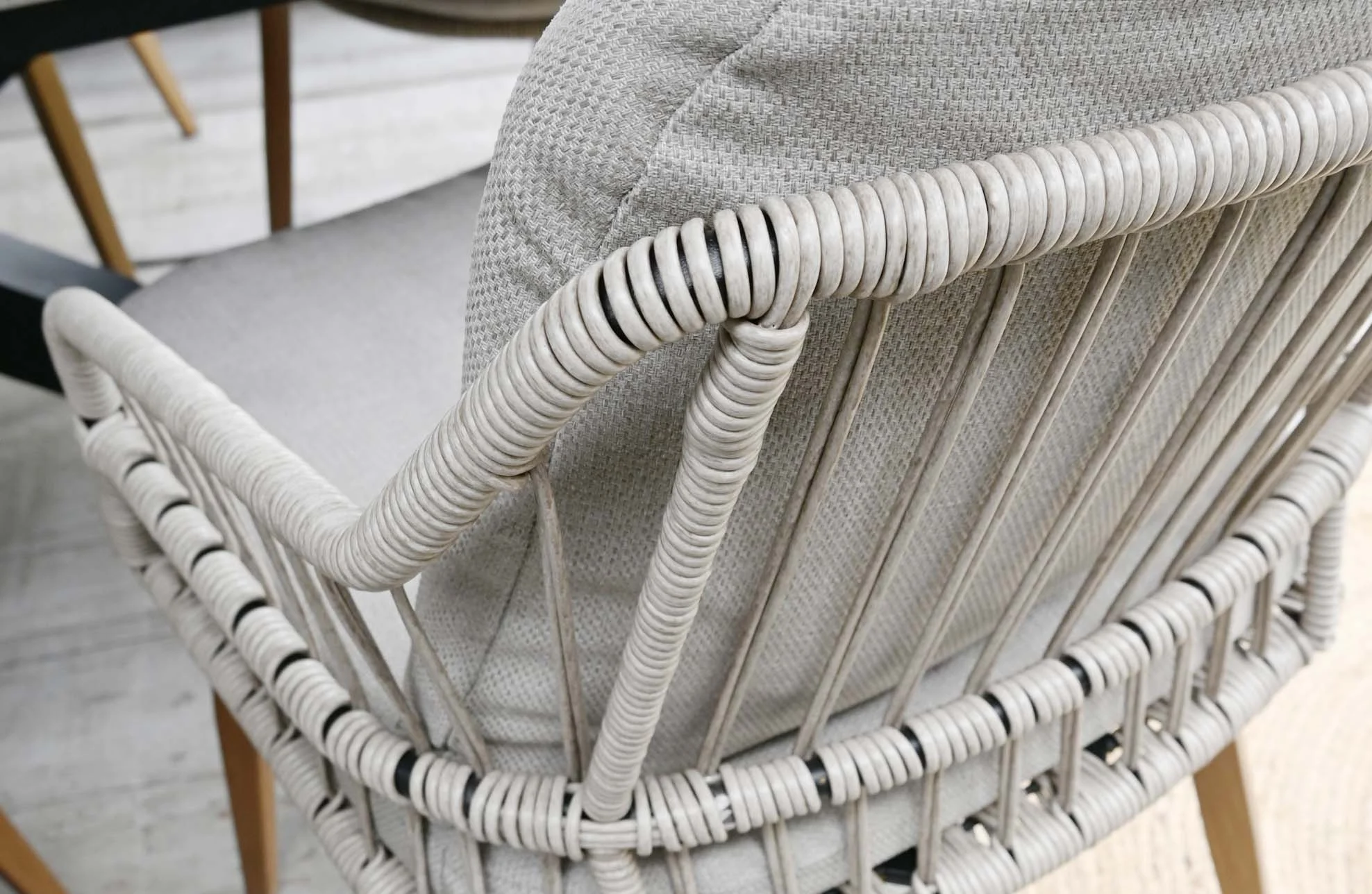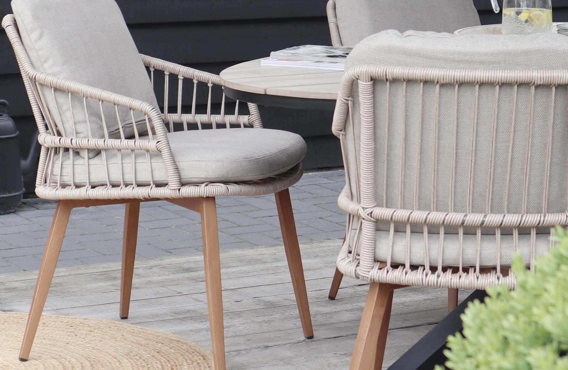 Ben je opzoek naar een stijlvolle tuinstoel met een scandinavisch design? Dan is de dining rope tuinstoel Isabel echt iets voor jou. Het is een echte eyecatcher voor in je tuin. De tuinstoel is bespannen met kunststof rope wat zeer flexibel, sterk en weerbestendig is. Door de flexibiliteit van het rope zal het de rug goed ondersteunen en neemt het de natuurlijke vorm van de rug aan. Het frame bestaat uit gepoedercoated aluminium in een houtskleur. De rope tuinstoel Isabel is apart verkrijgbaar in twee kleuren rope, namelijk Sand of Grey kleur en in combinatie met zwarte poten of houtlook poten.
