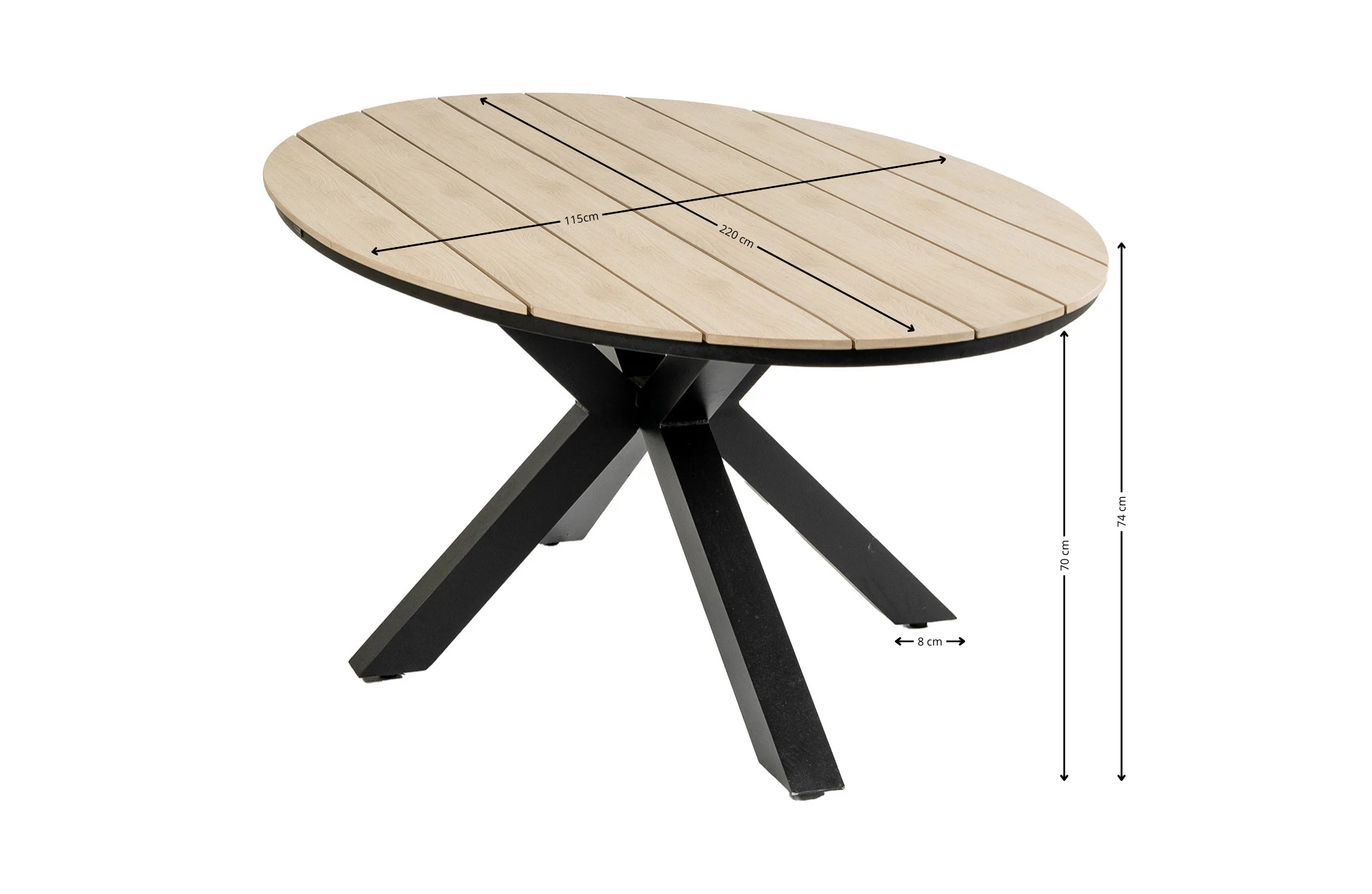 De ovale tuintafel bij deze set heeft een blad gemaakt van polywood met een aluminium kruispoot onderstel en is licht in gewicht. Hierdoor is de tafel makkelijk te verplaatsen en onderhoudsvrij. De ovale tuintafel wordt in delen geleverd en is eenvoudig met enkele schroeven en een duidelijke beschrijving te monteren. Wij adviseren de tuintafel, wanneer deze niet gebruikt wordt, af te dekken of op te bergen om de levensduur van het product te verlengen. Wij bieden hiervoor diverse beschermhoezen aan.