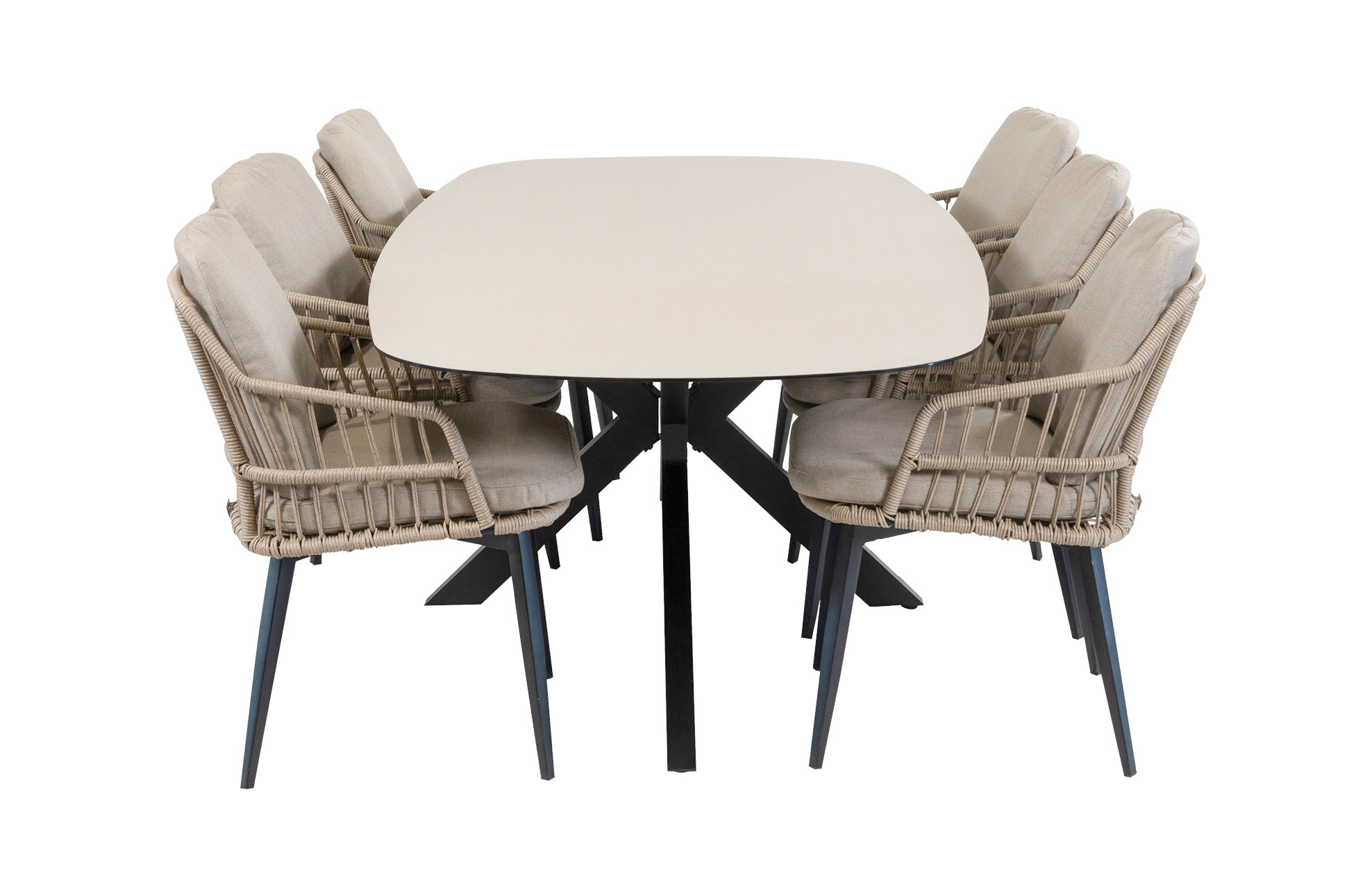 7-delige tuinset | 6 Isabel tuinstoelen (Sand) | Tuintafel Malaga 240x115cm (Black)