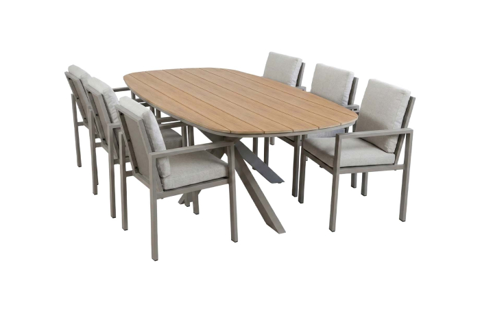 Een set die moderne vormgeving koppelt aan natuurlijke materialen. De Cadiz tuintafel van 240×115 cm in Camel met Tecon teak blad gecombineerd met zes Lumo dining tuinstoelen. Rustig in kleur, krachtig in lijnenspel.