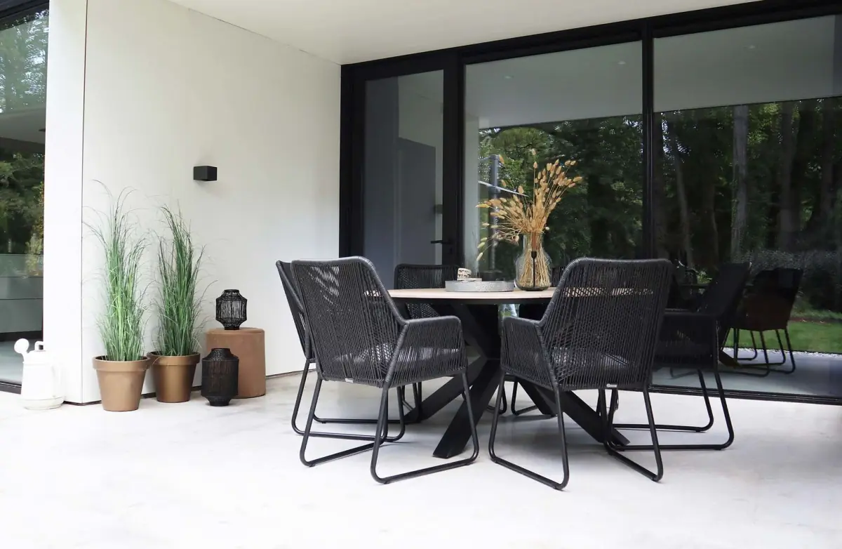 Ben je opzoek naar een stijlvolle tuinstoel met een scandinavische touch? Dan is de dining tuinstoel Mona echt iets voor jou. Het is een echte eyecatcher voor in je tuin. De tuinstoel is bespannen met kunststof rope wat zeer flexibel, sterk en weerbestendig is. Door de flexibiliteit van het rope zal het de rug goed ondersteunen en neemt het de natuurlijke vorm van de rug aan. Het frame bestaat uit gepoedercoated aluminium in de kleur zwart.