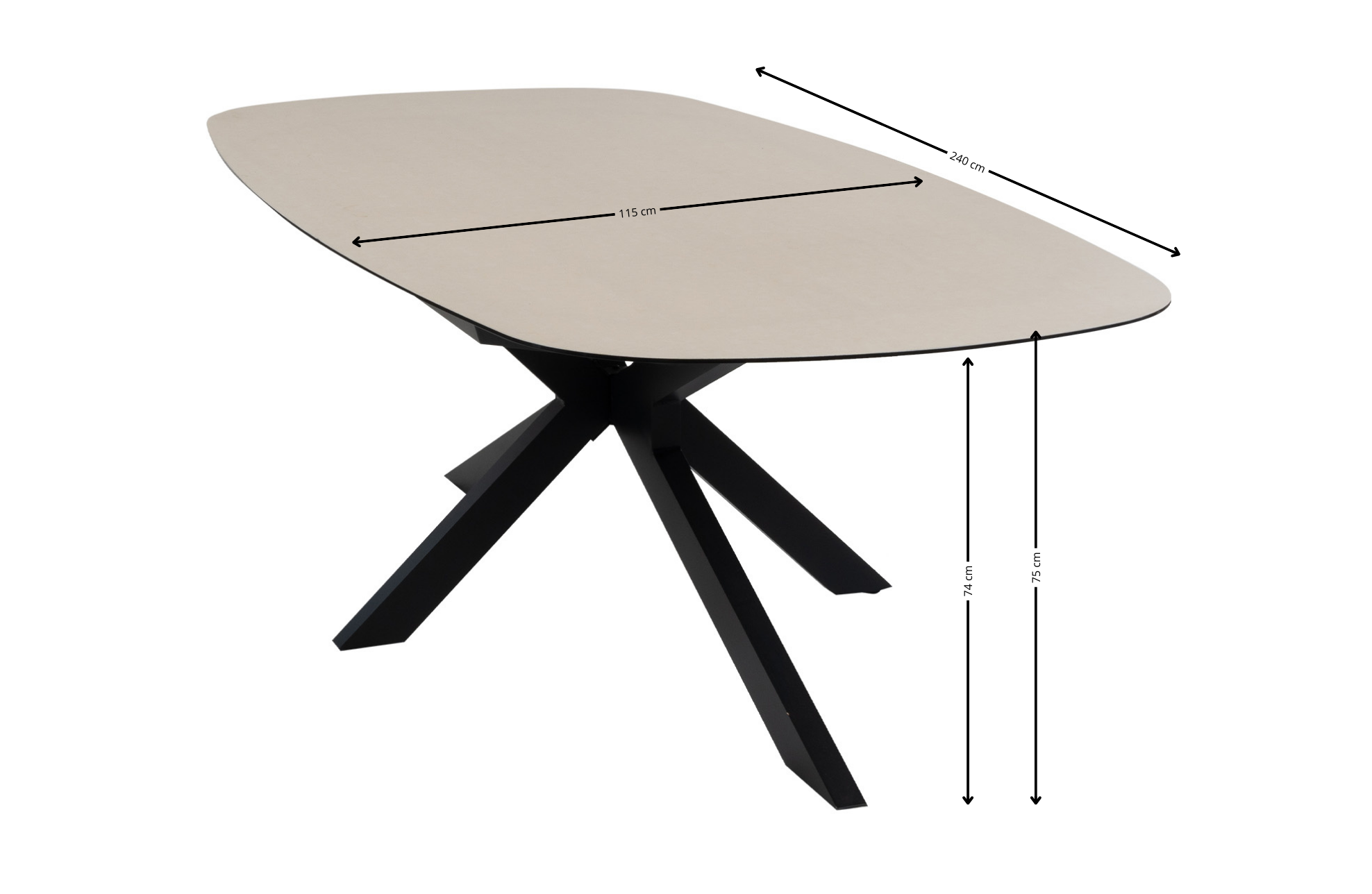 Ontdek de Malaga tuintafel van 4 Seizoenen Tuinmeubelen, nu in het royale formaat van 240x115 cm –perfect voor grotere buitenruimtes en gezellige diners met familie en vrienden. Deze tafel combineert verfijning en functionaliteit, met een elegant bootvormig tafelblad dat een unieke uitstraling geeft aan je terras. Het blad is uitgevoerd in de warme aardetint CerraVetro en is gemaakt van een mix van keramiek en glas. Dit materiaal is zowel stijlvol als robuust, bestand tegen verschillende weersomstandigheden en eenvoudig te onderhouden. De Black-kleurige spinpoot, vervaardigd uit hoogwaardig aluminium, zorgt voor een stevig en stabiel ontwerp en voegt een eigentijdse touch toe aan de tafel. Met zijn luxe uitstraling is de Malaga tuintafel ideaal voor een stijlvolle buitenomgeving. Combineer de tafel met comfortabele stoelen voor een compleet terras waar je volop kunt genieten van het buitenleven en lange, ontspannen maaltijden.