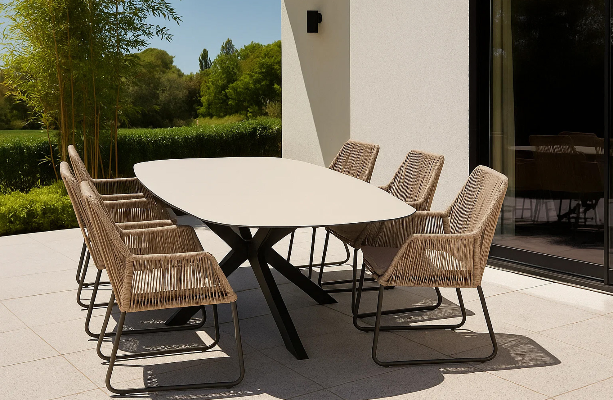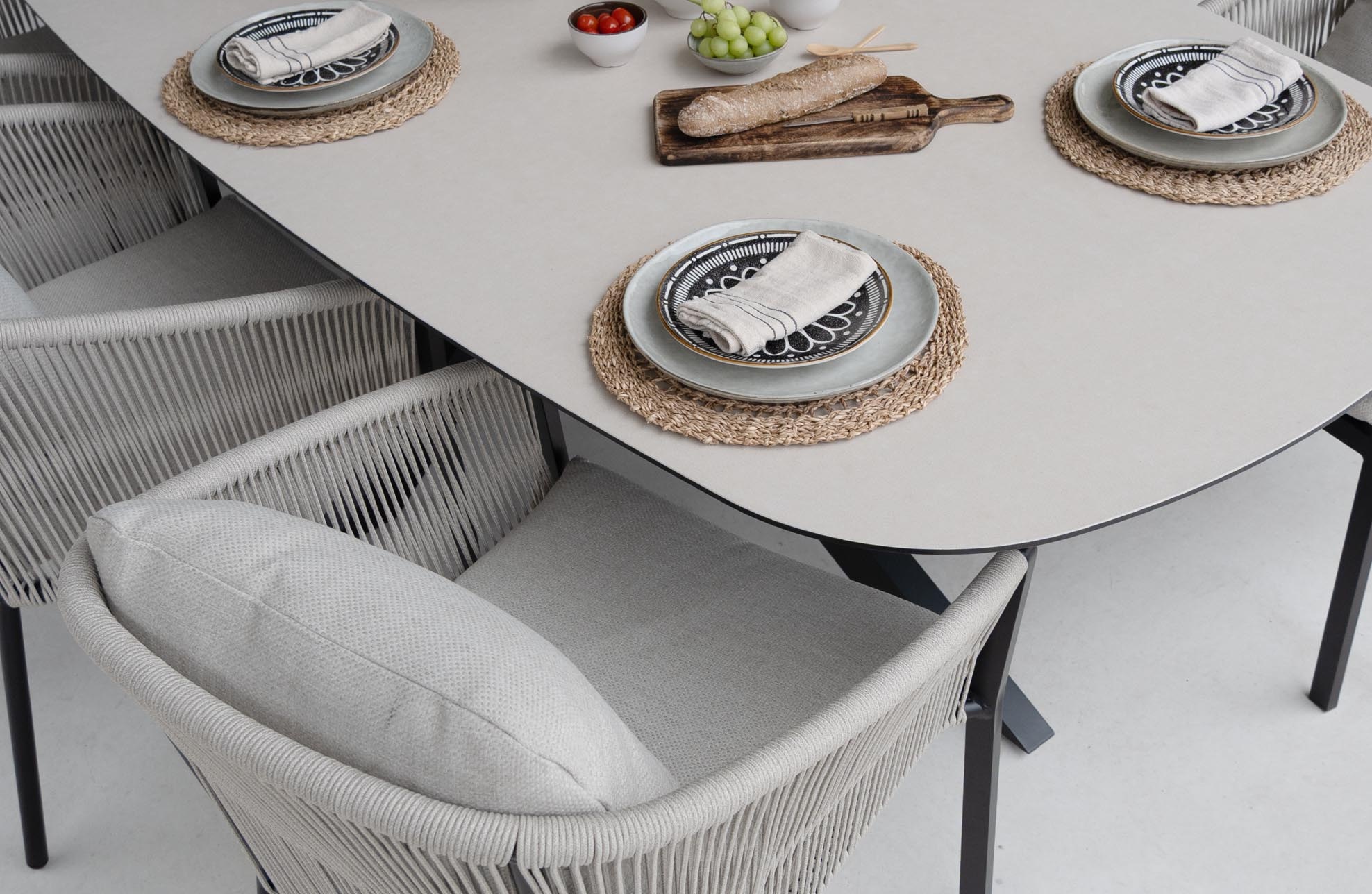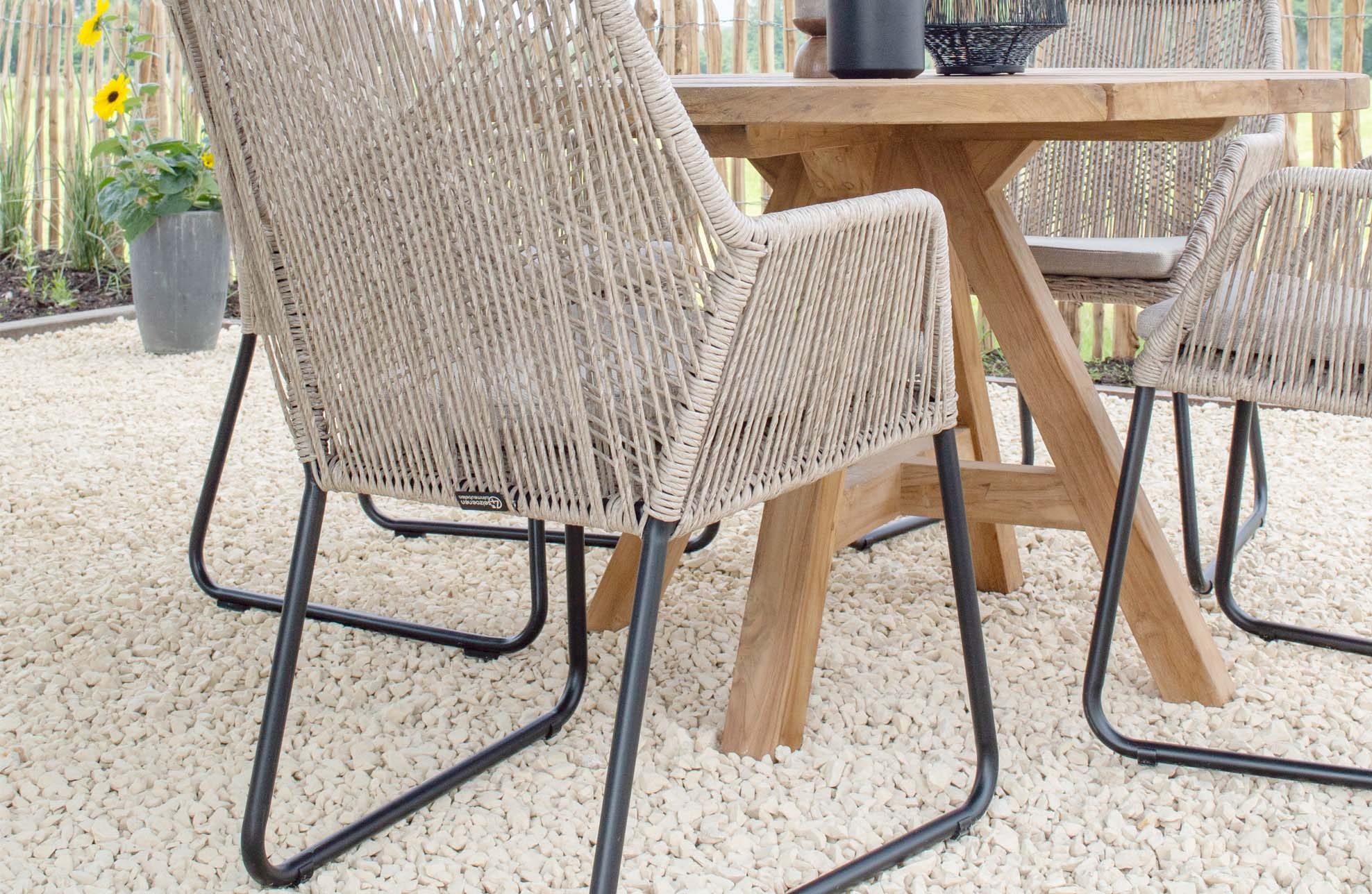 Deze prachtige tuintafel is gecombineerd met 6 zandkleurige Mona tuinstoelen, genoeg ruimte voor een fijn gezelschap. De Mona tuinstoel is bespannen met kunststof rope wat zeer flexibel, sterk en weerbestendig is. Door de flexibiliteit van het rope zal het de rug goed ondersteunen en neemt het de natuurlijke vorm van de rug aan.
