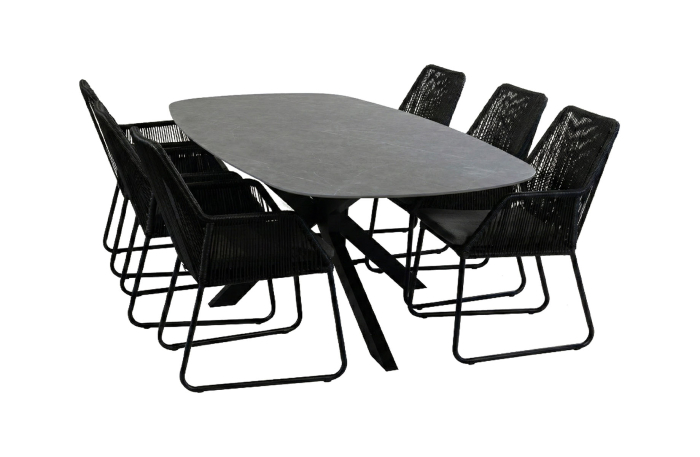 7-delige tuinset | 6 Mona tuinstoelen (Black) | Tuintafel Barletta 240x115cm (Desert Pearl/Black)