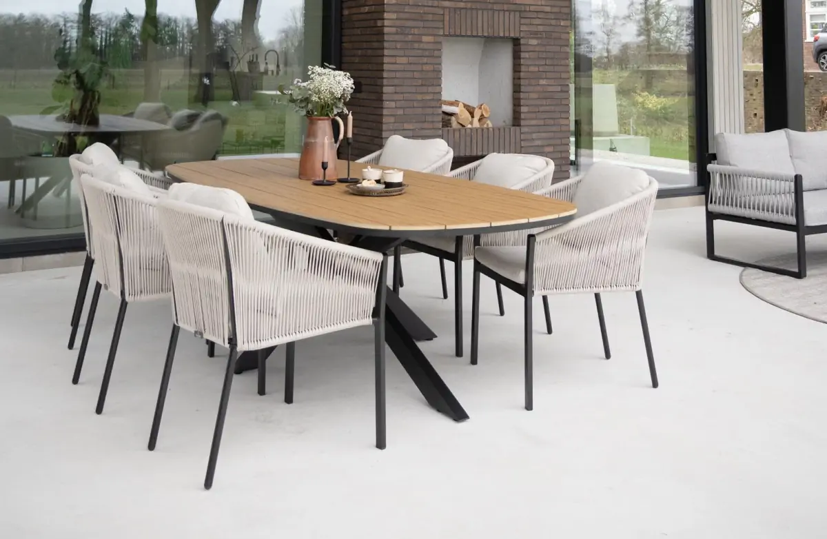 Deze grote ruime tuintafel is gecombineerd met 8 Camel Elvira tuinstoelen. Maak kennis met de Elvira stapelbare tuinstoel – een elegante en praktische keuze voor jouw buitenruimte. Deze stoel combineert een moderne uitstraling met optimaal zitcomfort, perfect voor elke gelegenheid. Het moderne aluminium frame zorgt voor een lichte, maar robuuste constructie die makkelijk te verplaatsen is, terwijl de stoel dankzij het stapelbare ontwerp efficiënt kan worden opgeborgen. De zitting en rugleuning van de Elvira tuinstoel zijn afgewerkt met duurzaam Sake-kleurig rope, dat niet alleen een warme uitstraling heeft maar ook een comfortabele ondersteuning biedt. Het rope past zich subtiel aan de natuurlijke vorm van de rug aan en biedt een flexibele en ergonomische zitervaring. De zachte kleurtonen van het frame en het rope maken de Elvira tuinstoel een ideale keuze voor zowel Japandi als Scandinavische tuinstijlen, en voegen een rustgevende uitstraling toe aan jouw terras of tuin.