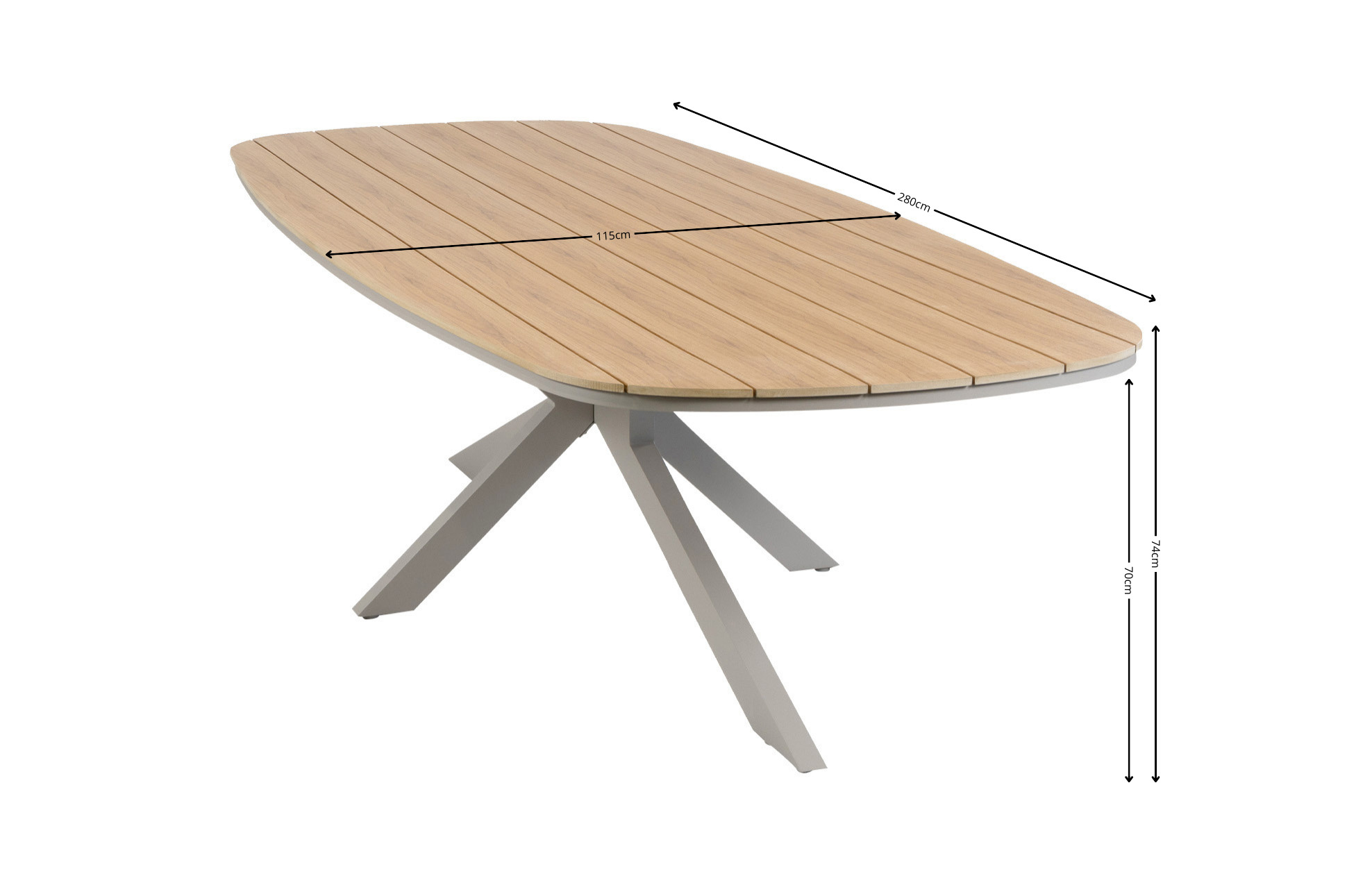 De Cadiz tuintafel is een stijlvolle blikvanger voor elke buitenruimte, ideaal voor lange zomeravonden en gezellige diners. Met zijn royale formaat van 280x115 cm biedt deze tafel volop ruimte voor een groot gezelschap, terwijl het unieke, bootvormige blad een speelse en uitnodigende uitstraling geeft. Het tafelblad is vervaardigd van Tecon Teak, een onderhoudsvriendelijk materiaal dat de warme, natuurlijke uitstraling van echt teakhout biedt zonder intensief onderhoud. De spinpoot in de kleur Camel voegt een moderne, stevige basis toe, die niet alleen stabiliteit biedt maar ook een fraai designaccent aan de tafel geeft. De poot is van binnen verstevigd met een stuk staal voor extra stabiliteit. De combinatie van het warme Camel frame en de natuurlijke houtkleur van het blad maakt de Cadiz veelzijdig inzetbaar in verschillende stijlen, van modern tot klassiek landelijk. Kies voor de Cadiz tuintafel en geniet van ruimte, design, en comfort in jouw tuin!