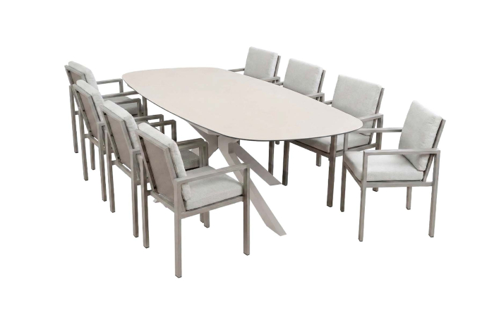 Een royale dining set waarin strak design en praktische materialen samenkomen. De Malaga tuintafel van 280×115 cm in Camel en het tafelblad in Cerra Vetro gecombineerd met acht Lumo dining tuinstoelen. Modern, onderhoudsarm en visueel rustig.