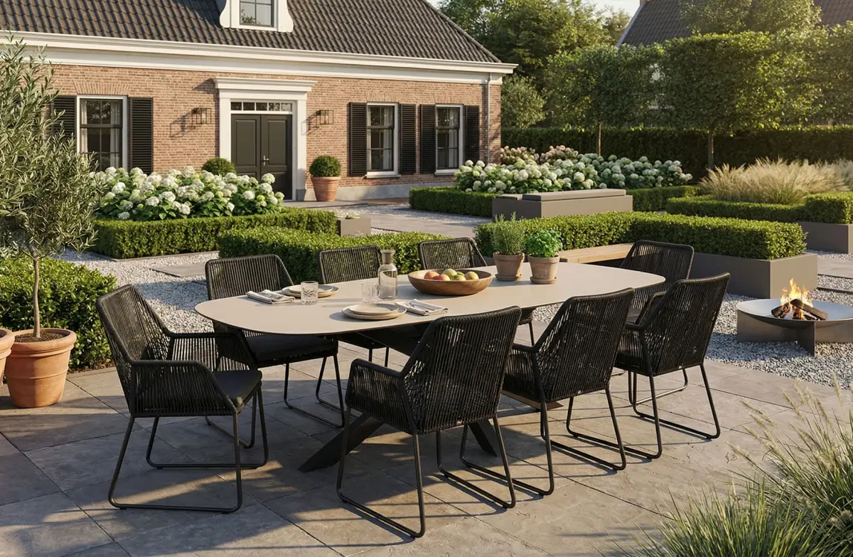 9-delige tuinset | 8 Mona tuinstoelen (Sand) | Tuintafel Malaga 280x115cm (Black)