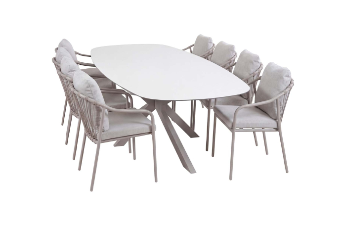 De set wordt gecombineerd met 8 Parijs dining tuinstoelen. Deze moderne stoelen zijn licht van gewicht dankzij het aluminium frame in Camel en daardoor eenvoudig te verplaatsen. De rope rugleuning in Mocca biedt een natuurlijke ondersteuning doordat het materiaal zich licht naar de rug vormt. De meegeleverde zit- en rugkussens hebben een Latte kleur en zorgen voor extra comfort, zodat je urenlang ontspannen kunt blijven zitten.