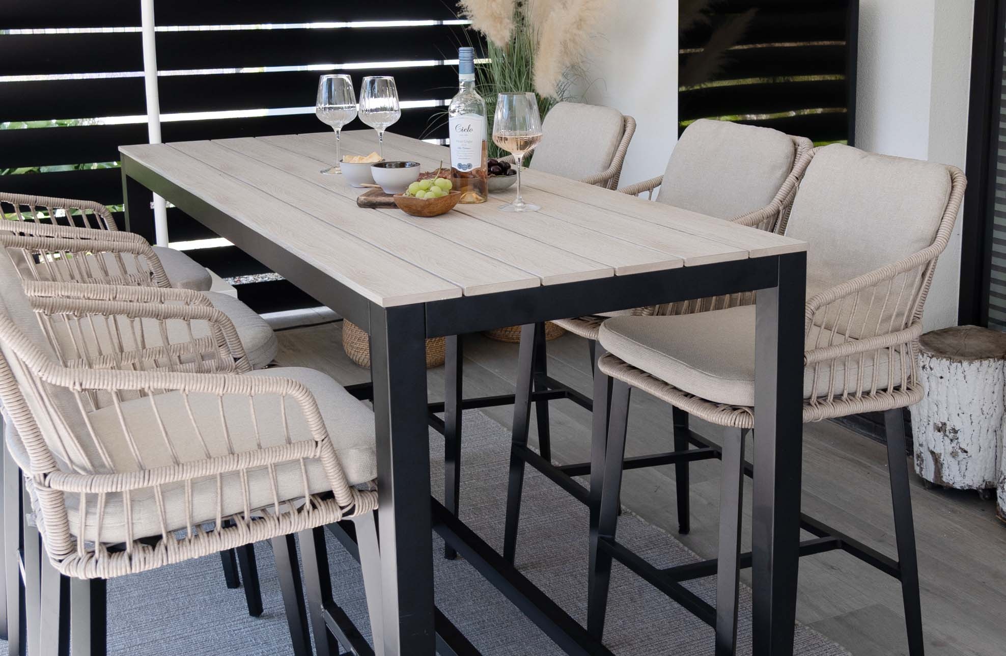 Ben je opzoek naar een stijlvolle barstoel met een Scandinavische touch? Dan is de barstoel Isabel in de kleur beige/naturel echt iets voor jou. Het is een echte eyecatcher voor in je tuin. De gevlochten barstoel voor buiten is bespannen met kunststof rope wat zeer flexibel, sterk en weerbestendig is. Door de flexibiliteit van het rope zal het de rug goed ondersteunen en neemt het de natuurlijke vorm van de rug aan. Het sand/beige kussen geeft comfort en is waterafstotend. Wij adviseren deze bij langdurige regenval op te bergen. De barstoel Isabel is ook verkrijgbaar in het zwart. Voor een prettig zitcomfort is de barstoel voorzien van een rug- en armleuning. Combineer de Isabel barstoel met de bijpassende Cyprus bartafel in wood kleur. Ook als complete barset te bestellen.