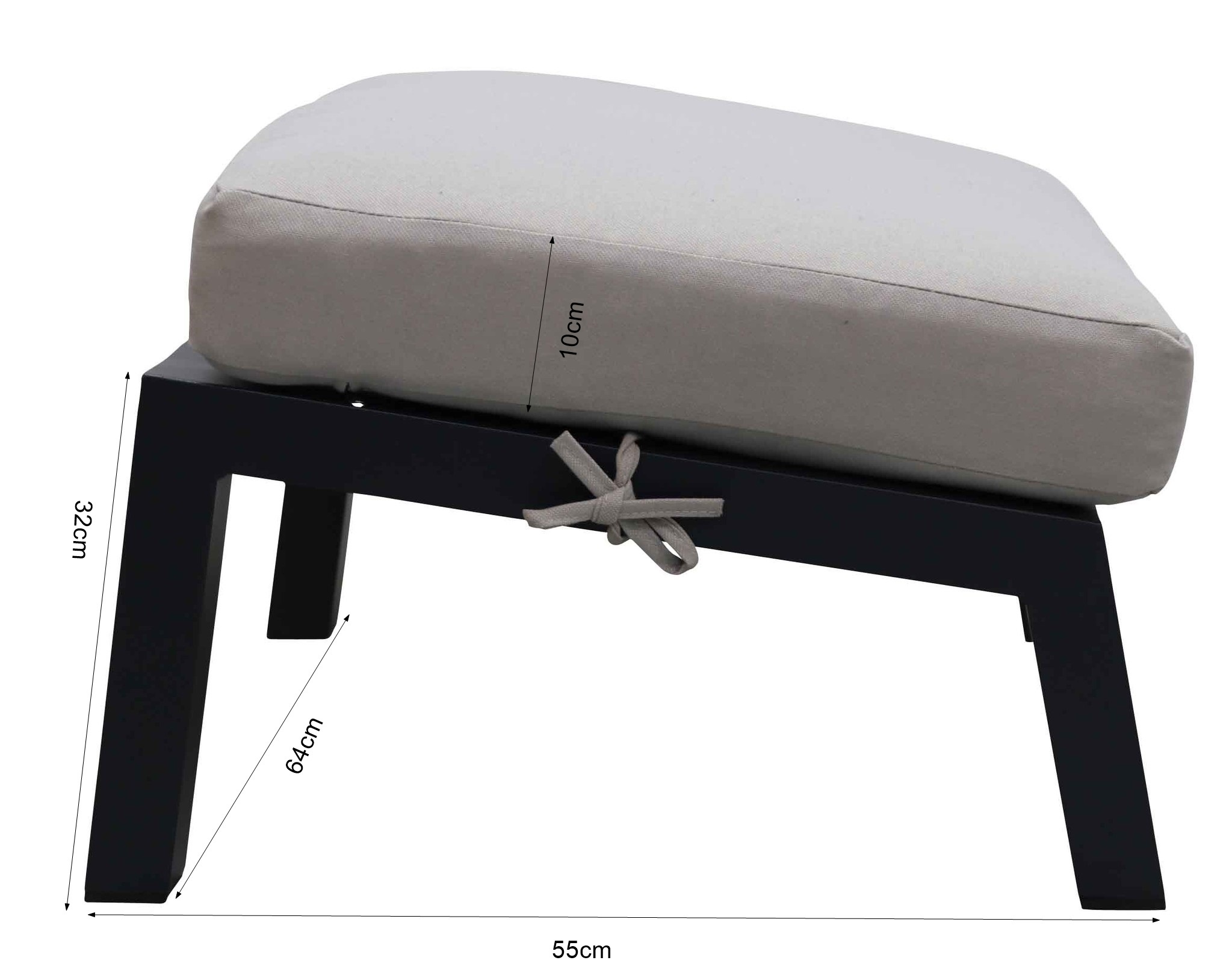 De bijpassende voetenbank van de Bezano set is niet alleen een praktische aanvulling, maar ook een essentieel element voor optimale ontspanning. Het aluminium frame is eveneens gepoedercoat in Matt Black, waardoor de voetenbank perfect aansluit bij de loungestoel. Het dikke off-white kussen biedt uitstekend comfort en is voorzien van handige lusjes, zodat het stevig vastzit en niet verschuift tijdens gebruik. De schuin aflopende zijde van de voetenbank zorgt ervoor dat je benen volledig kunnen ontspannen, wat ideaal is na een lange dag.