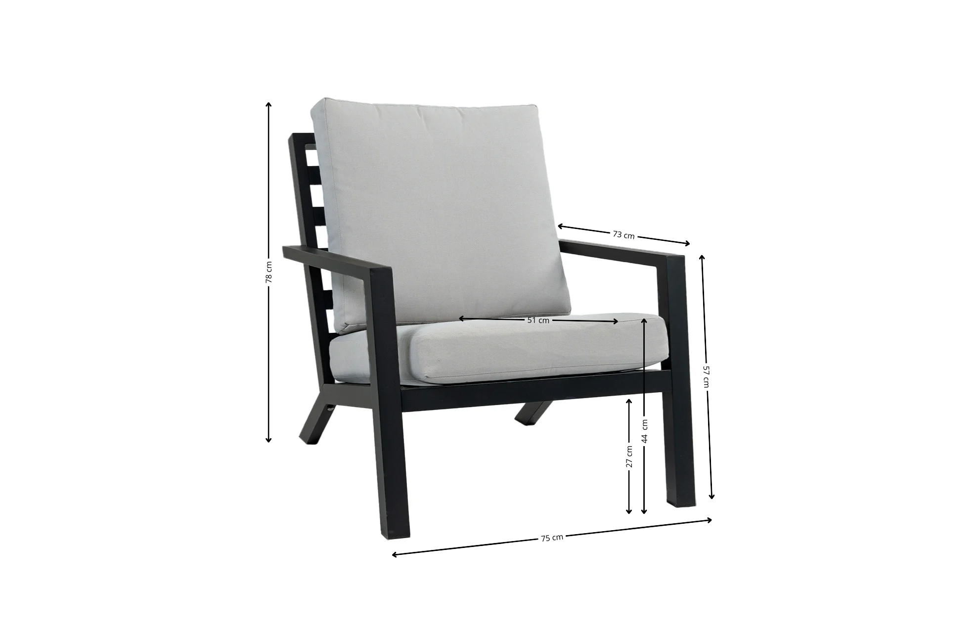 De Bezano loungestoel combineert een prachtige uitstraling met uitzonderlijk zitcomfort. Deze stoel is een must-have voor wie op zoek is naar een luxe en comfortabele toevoeging aan de tuin of het terras. Dankzij de diepe zit en de royale kussens wordt ontspannen in de Bezano loungestoel een ultieme ervaring. De off-white loungekussens van de Bezano zijn maar liefst 10 cm dik en bieden een ongeëvenaard zitcomfort. De zachte, hoogwaardige stof voelt prettig aan en is perfect om in weg te zakken na een lange dag. Het frame van de stoel is volledig gemaakt van duurzaam aluminium en heeft een stijlvolle poedercoating in de kleur Matt Black, wat zorgt voor een modern en tijdloos design.