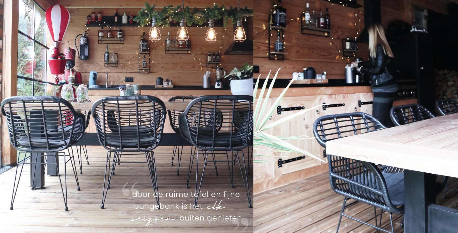 Stijlvolle tuinmeubelen mochten zeker niet ontbreken in de tuin en onder de overkapping. Marlies zou haar stijl als modern en landelijk omschrijven. Een prachtige lange tafel van 3 meter met trendy tuinstoelen, biedt voldoende zitplekken voor maar liefst 8 personen. Bij het uitzoeken van de loungeset was het een must dat er een hoge tafel aangeschoven kon worden, waardoor ze er ook aan kunnen dineren.