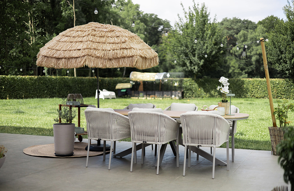 Met de ruime eettafel Cadiz, comfortabele Elvira tuinstoelen van gevlochten touw en een natuurlijke parasol erboven vormt het terras het hart van het buitenleven. Hier wordt gegeten, gelachen en geleefd.