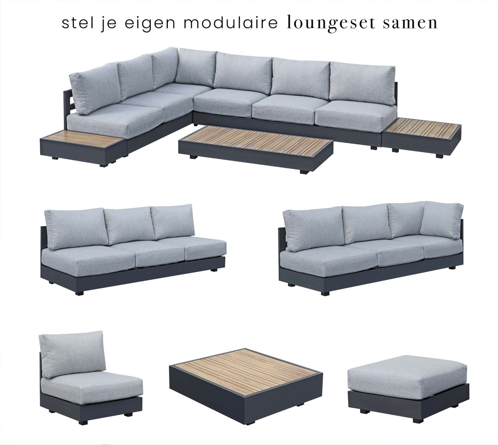 Onze zelf samen te stellen loungesets zijn altijd voorzien van heerlijke dikke loungekussens. Dit zorgt voor een lekker zacht zitvlak en het oogt knus en gezellig. Om jouw modulaire loungeset nog perfecter te maken kan je natuurlijk ook je terras gezellig aankleden. In ons ruime assortiment aan tuindecoratie kan je bijvoorbeeld kiezen voor wat mooie tuin sierkussens, een parasol of een sfeervol buitenkleed. Hiermee creëer je meteen een plek in de tuin waar je het liefst elke dag zou willen doorbrengen.