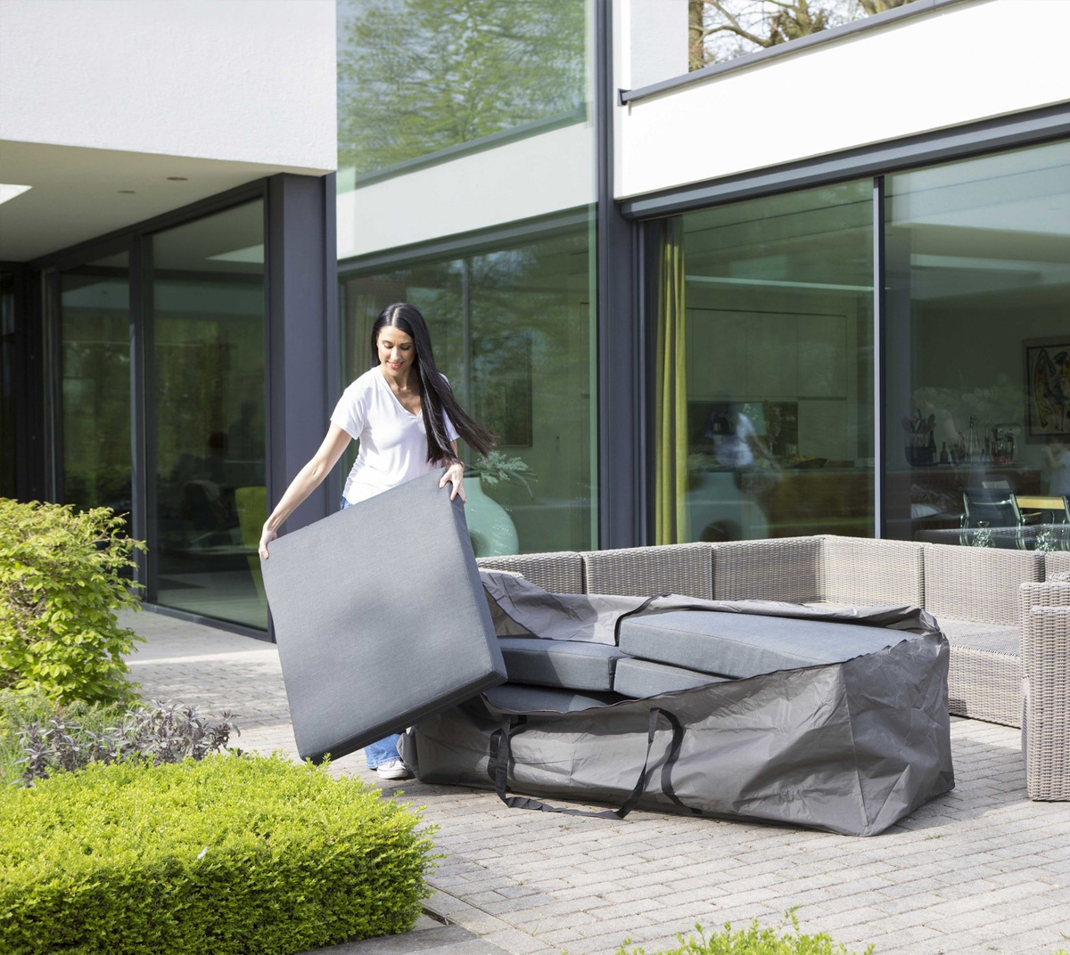 Een stevige kussentas is ideaal om je kussens snel op te bergen bij wisselvallig weer. Let hierbij op:Kies voor een waterafstotende tas met ventilatieopeningen. Dit voorkomt condens en schimmel.