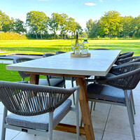 Stijlvolle tuinmeubelen mochten zeker niet ontbreken in de tuin en onder de overkapping. Marlies zou haar stijl als modern en landelijk omschrijven. Een prachtige lange tafel van 3 meter met trendy tuinstoelen, biedt voldoende zitplekken voor maar liefst 8 personen. Bij het uitzoeken van de loungeset was het een must dat er een hoge tafel aangeschoven kon worden, waardoor ze er ook aan kunnen dineren.