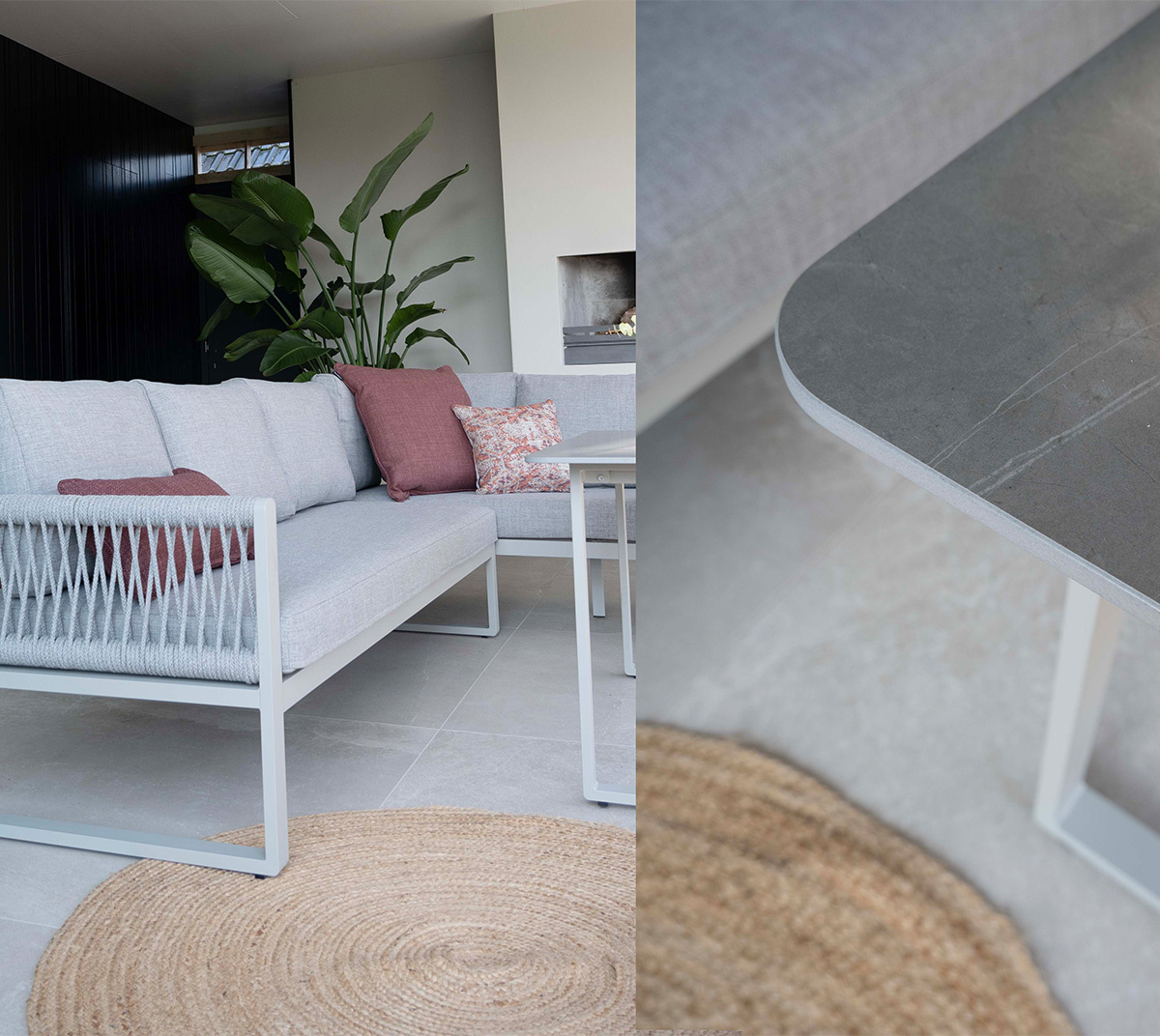 Niet elke tuin biedt ruimte voor twee aparte sets. De Reims is daarom een praktische oplossing. De set is verkrijgbaar in verschillende opstellingen, zodat je hem kunt aanpassen aan de indeling van jouw tuin. Je kunt kiezen voor een linker- of rechterhoek en voor de kleuren sand of black. Daarmee past hij goed in verschillende stijlen tuinen.
