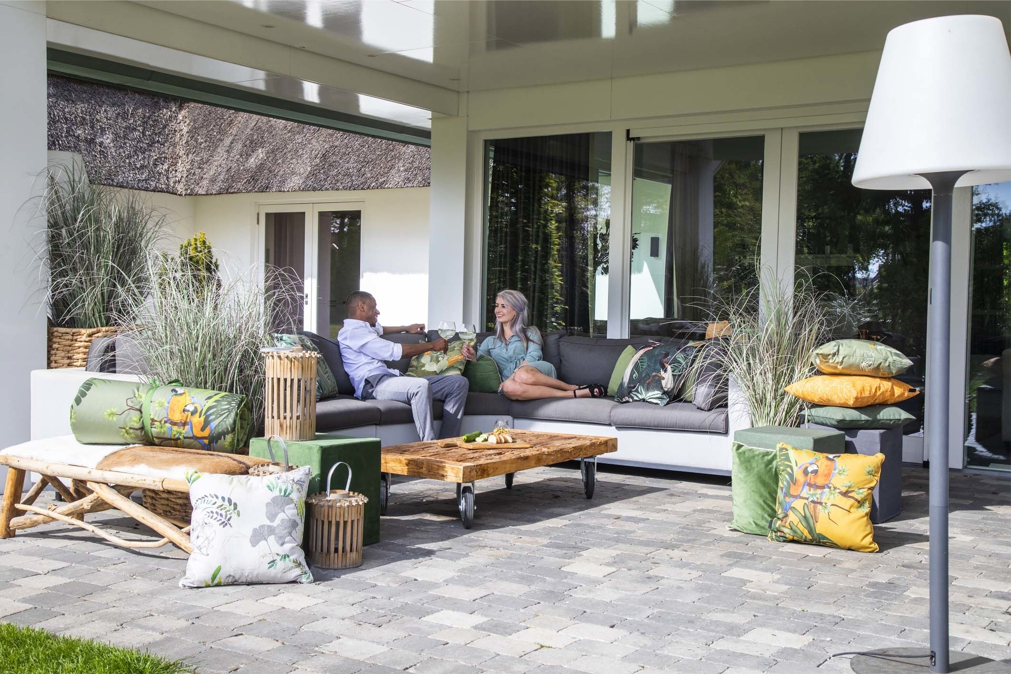 Wil je echte eye catchers op het terras? Kies dan voor onze ‘Riff Yellow’. Deze hoge kussens voor in de tuinstoel hebben een opvallende exotische print met papegaaien en botanische bladeren, op deze manier maak je in de tuin een echt statement.