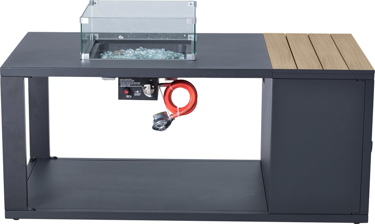 De Capri Firepit Table van Sens-Line is een stijlvolle en moderne vuurtafel die warmte en sfeer brengt in elke buitenruimte. Deze luxe vuurtafel werkt op gas en heeft een stevig aluminium frame dat bestand is tegen diverse weersomstandigheden. Aan de bovenkant van één zijkant is een detail verwerkt dat lijkt op houten plankjes, maar in werkelijkheid gemaakt is van duurzaam HPL. Dit geeft de tafel een luxe en natuurlijke uitstraling zonder in te leveren op onderhoudsgemak.