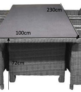 De Dublin wicker tuinset is gemaakt van halfrond gecombineerd met rond wicker vlechtwerk op een aluminium frame. De tafel is voorzien van een keramiek blad. Set bestaande uit 6 verstelbare tuinstoelen en 230cm lange tafel. De Dublin wicker tuinstoelen zijn gemaakt van halfrond gecombineerd met rond wicker vlechtwerk op een aluminium frame. De tuinstoel is voorzien van een dik grijs zit- en rugkussen die afritsbaar zijn en dus ook uit wasbaar. De stoelen zijn eenvoudig doormiddel van een gasveer verstelbaar. Met deze tuinstoelen creëer je de perfecte dining wicker tuinset. Wij raden aan de kussens en de tuinset wanneer deze niet gebruikt worden op te bergen of af te dekken.