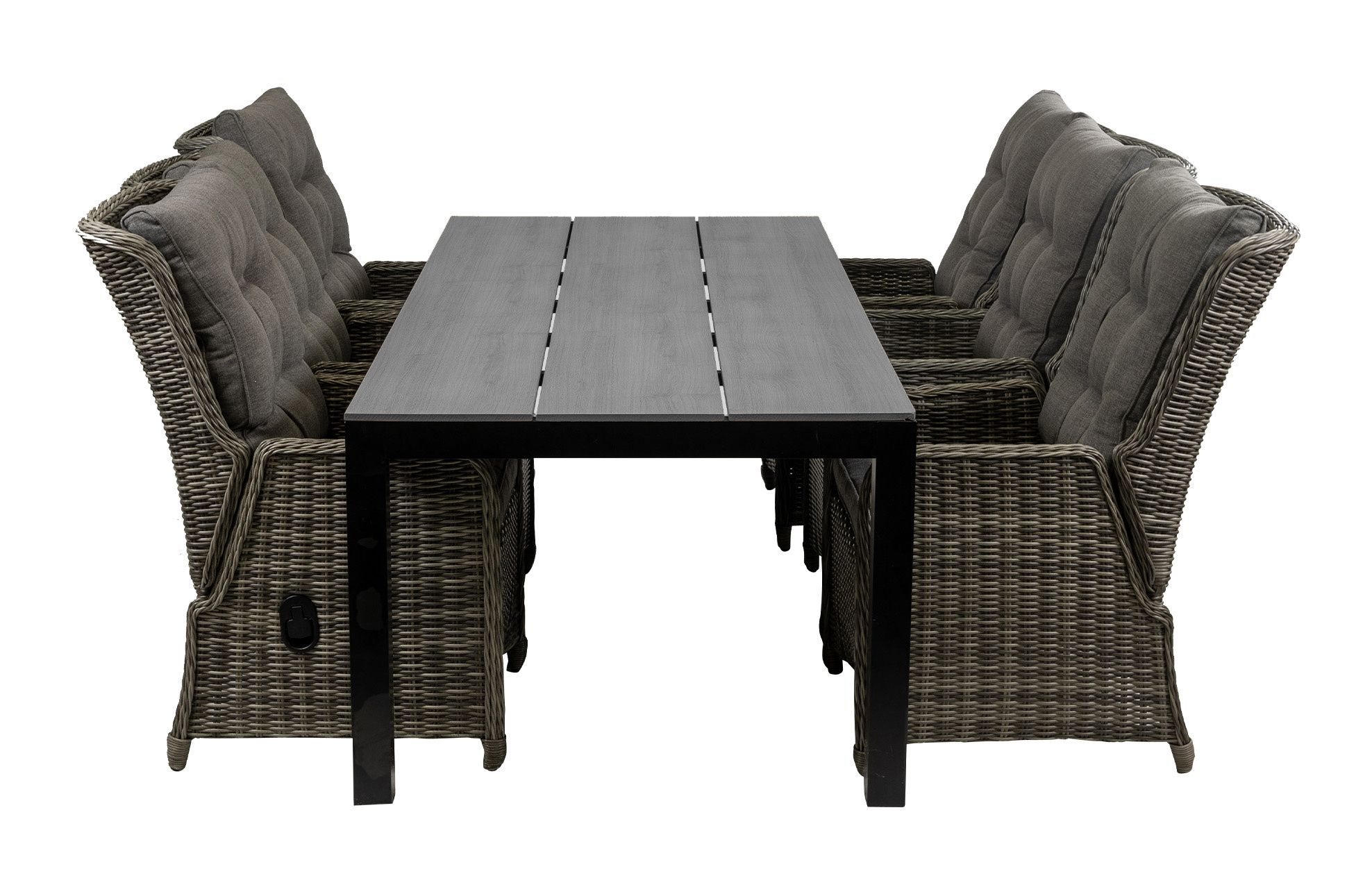 De Dublin wicker tuinset is gemaakt van halfrond gecombineerd met rond wicker vlechtwerk op een aluminium frame. De tafel is voorzien van een polywood blad bestaande uit 3 brede plank delen. De Dublin wicker tuinstoelen zijn gemaakt van halfrond gecombineerd met rond wicker vlechtwerk op een aluminium frame. De tuinstoel is voorzien van een dik grijs zit- en rugkussen die afritsbaar zijn en dus ook uit wasbaar. De stoelen zijn eenvoudig doormiddel van een gasveer verstelbaar. Met deze tuinstoelen creëer je de perfecte dining wicker tuinset. Wij raden aan de kussens en de tuinset wanneer deze niet gebruikt worden op te bergen of af te dekken.