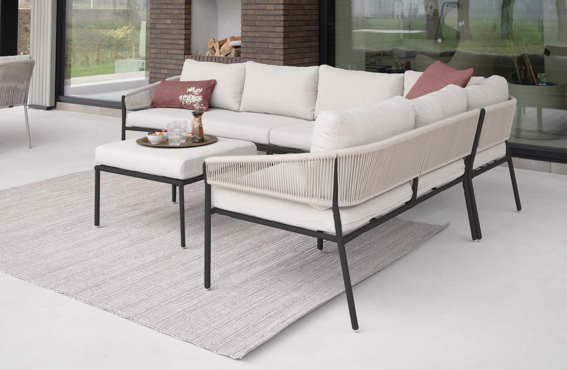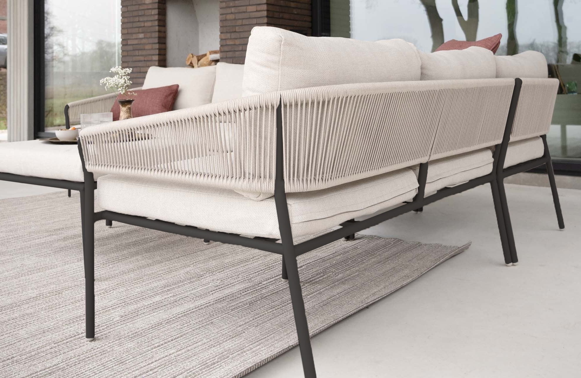 Maak kennis met de hoek loungeset Elvira, waar stijl en comfort op een moderne manier samenkomen. Deze loungeset is ideaal voor wie op zoek is naar een iets verhoogde zitpositie, wat bijdraagt aan een ontspannen en comfortabele lounge-ervaring. Het stijlvolle zwartkleurige aluminium frame straalt warmte uit, terwijl de bijpassende beige kussens zorgen voor een mooi ton-sur-ton effect dat perfect opgaat in zowel Japandi als Scandinavische tuinstijlen. De zwarte loungeset is niet alleen elegant, maar ook functioneel en duurzaam. Het lichte aluminium frame zorgt voor een stevige constructie. De bekleding van Sake-kleurig rope voegt een unieke textuur toe en is weerbestendig, wat de set ideaal maakt voor langdurig buitengebruik.