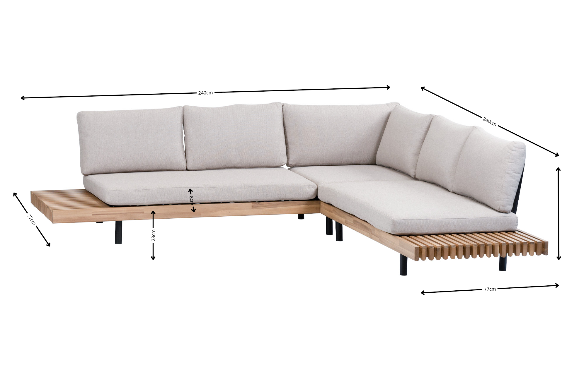 Breng stijl en comfort samen in jouw tuin met de moderne Lissabon hoek loungeset. Deze royale houten loungeset straalt luxe en ontspanning uit en is ideaal voor lange zomeravonden met vrienden of familie. Het frame heeft een warme teaklook afwerking die een natuurlijke en eigentijdse uitstraling geeft aan jouw buitenruimte.
