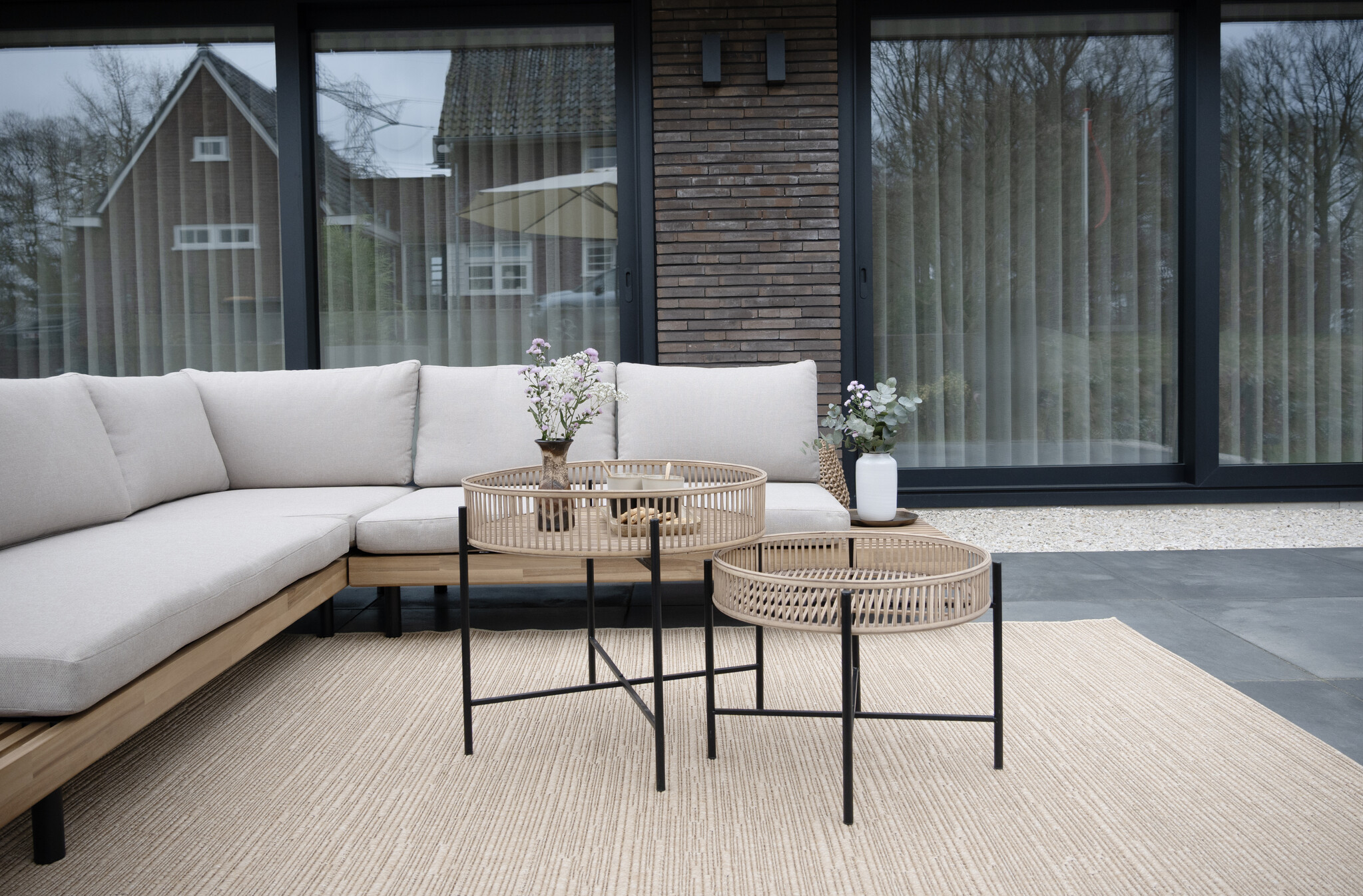 De set bestaat uit een linker bankdeel, een rechter bankdeel en een ruime vierkante salontafel van 80x80 cm, vervaardigd uit hetzelfde materiaal als de set. Deze bijpassende lage loungetafel maakt de set compleet en is perfect voor je hapjes, drankjes of sfeervolle accessoires. De losse bankdelen kun je desgewenst eenvoudig aan elkaar bevestigen met tiewraps, zodat de set stevig op z’n plek blijft.