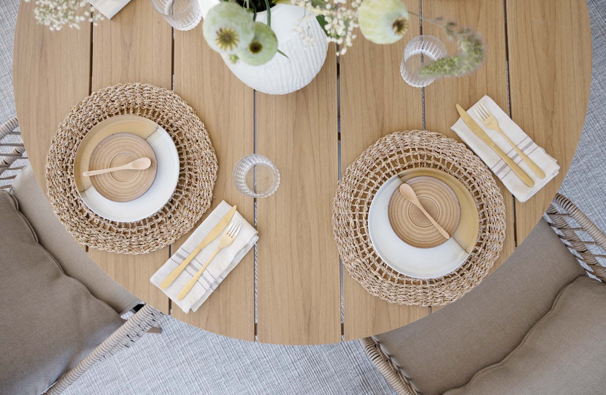 Het tafelblad van de Tower tuintafel is gemaakt van Tecon Teak, een innovatief materiaal dat de warme, natuurlijke uitstraling van echt teak perfect nabootst. Tecon Teak biedt de schoonheid van hout, maar met de duurzaamheid en onderhoudsvriendelijkheid van polywood, waardoor het bestand is tegen verschillende weersomstandigheden zonder dat het vergrijst of veel onderhoud vereist. Het ronde blad heeft een warme houtlook die ideaal past bij uiteenlopende stijlen en omgevingen.