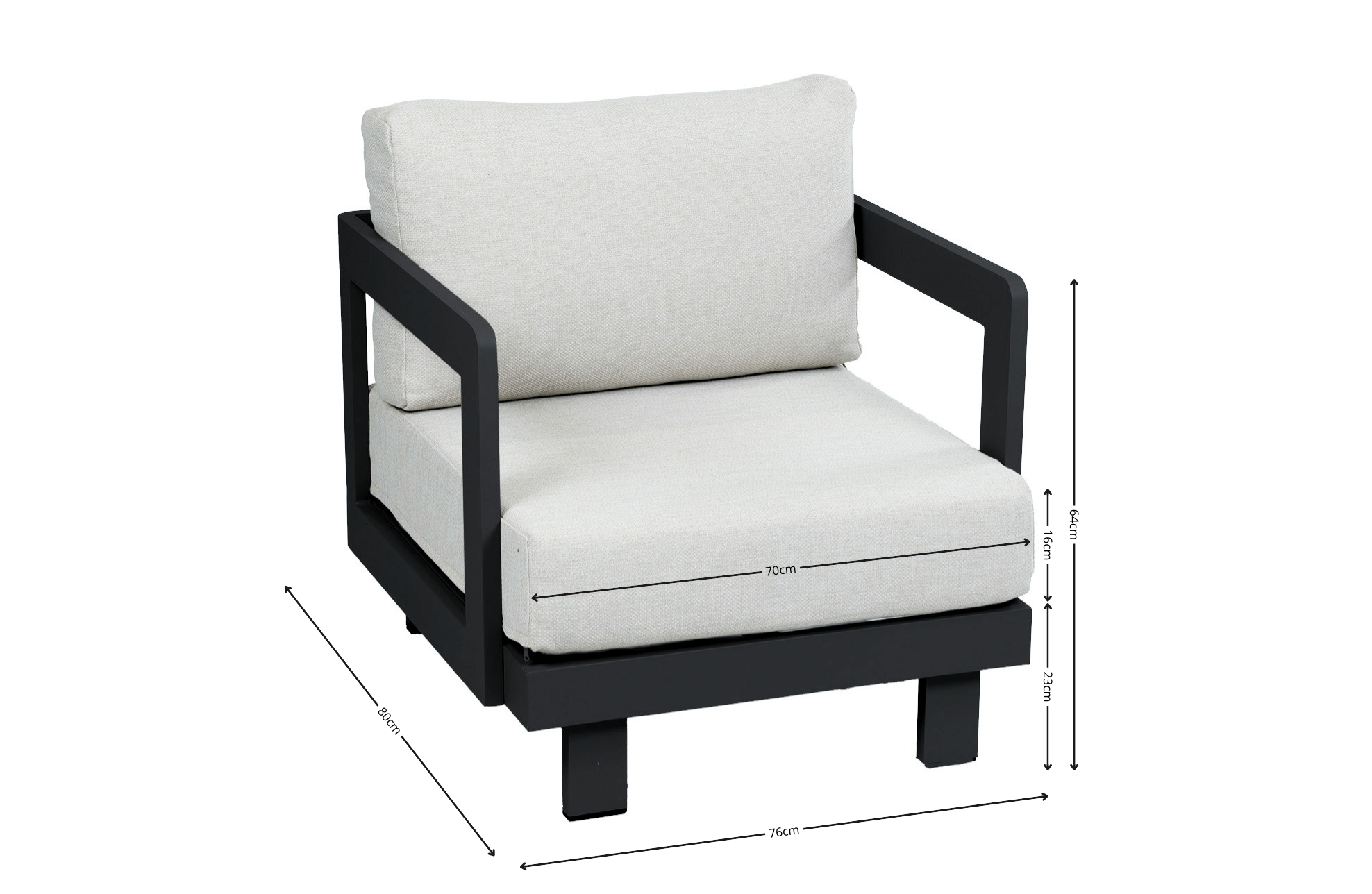 Zowel de bank als de stoelen zijn voorzien van een stevig aluminium frame in een diepe, stijlvolle zwarte kleur. De royale zitkussens in een verfijnde zandkleur zorgen voor een warm contrast en bieden uitzonderlijk comfort. De kussens zijn speciaal ontworpen voor gebruik buitenshuis, zodat je zorgeloos kunt genieten van het buitenleven. Voor langdurig behoud van de kwaliteit raden we aan de kussens bij slecht weer droog op te bergen.