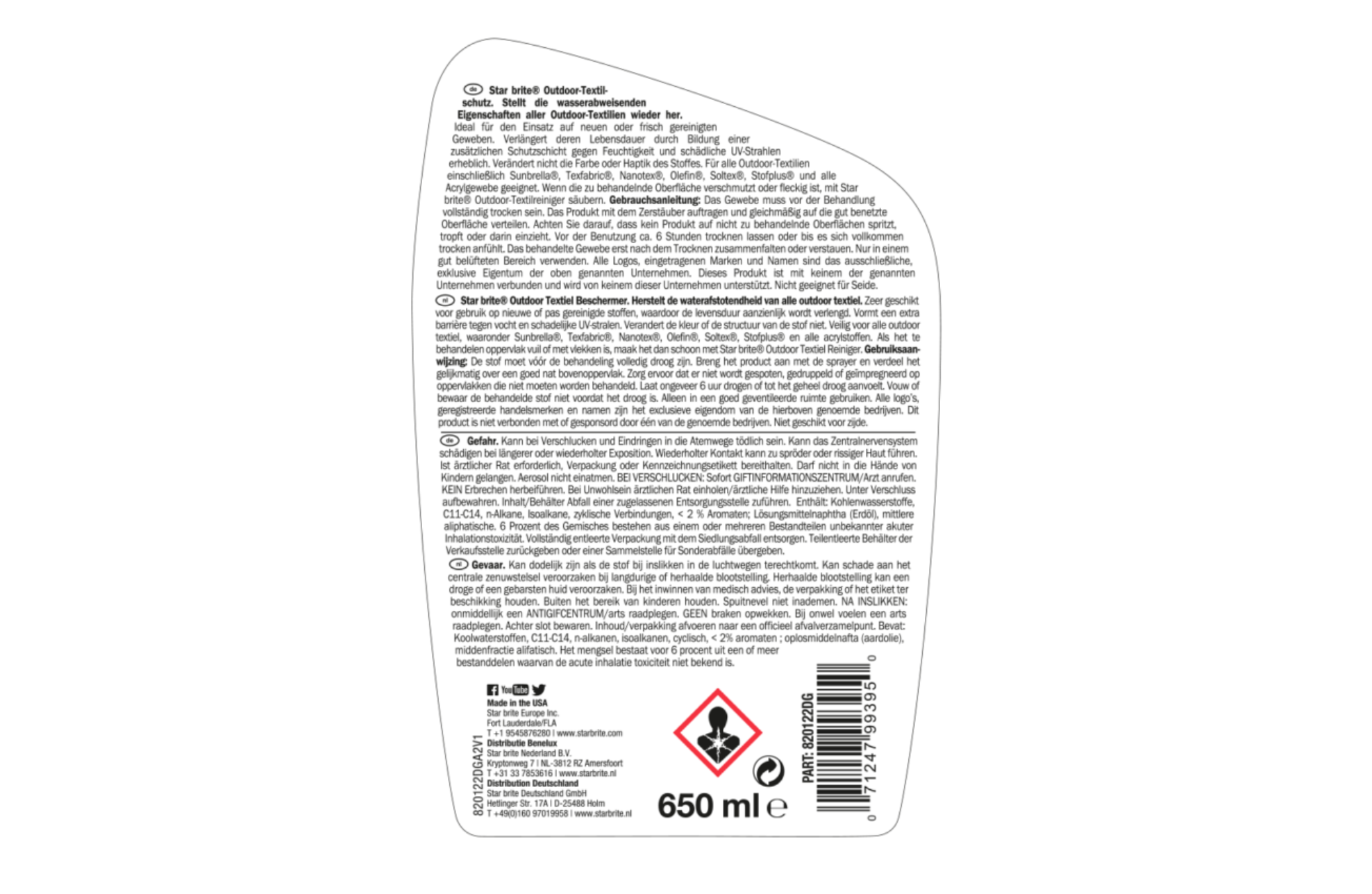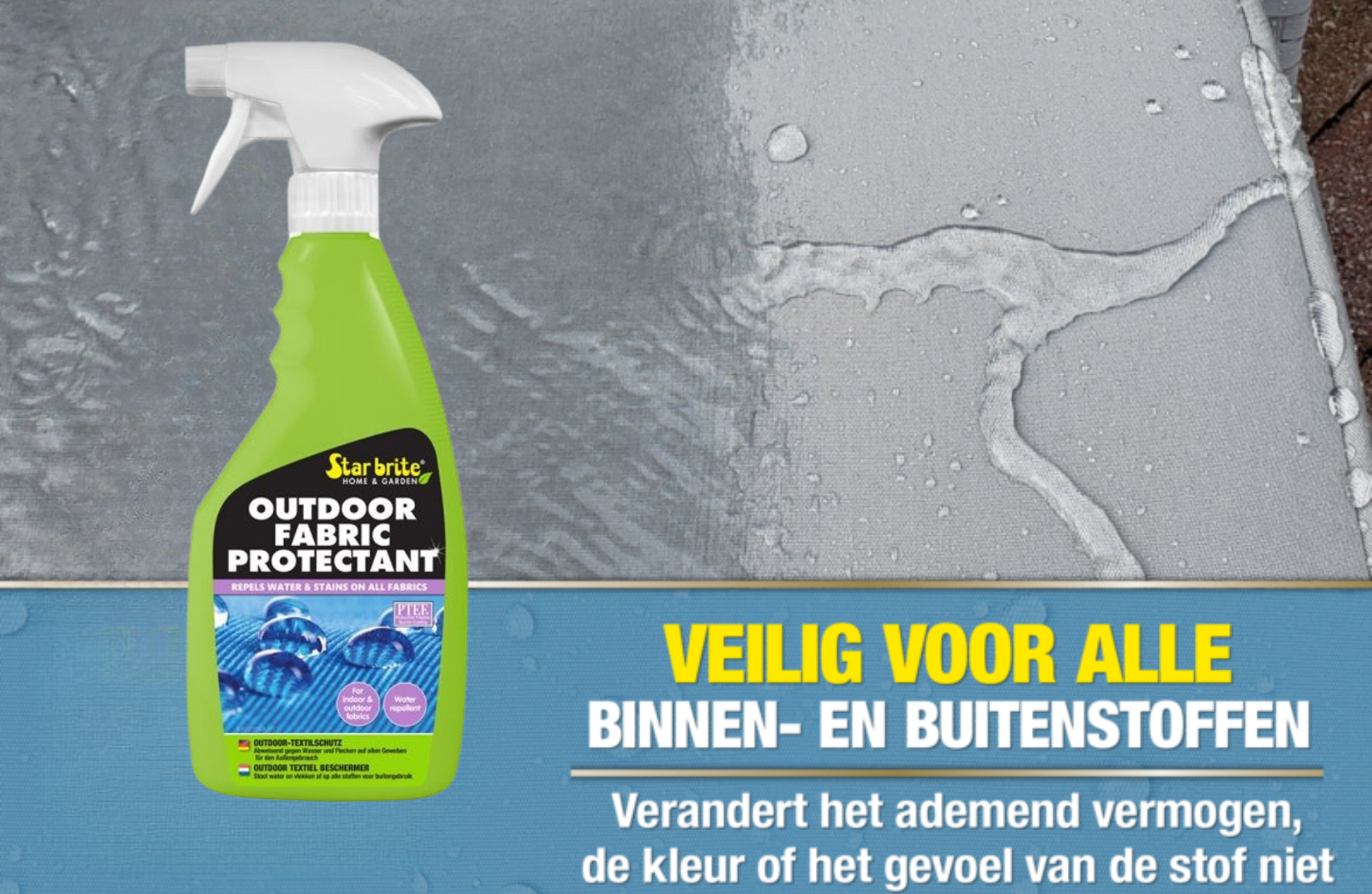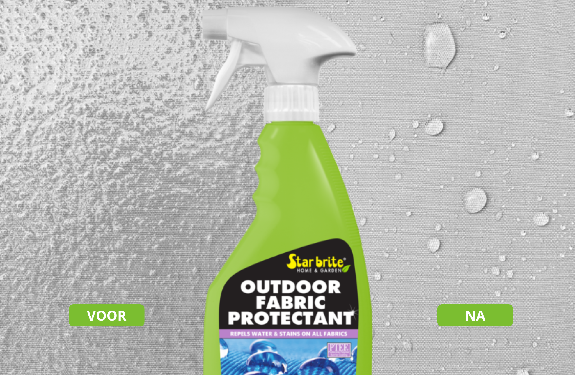Deze textiel beschermer herstelt de waterafstotendheid van alle outdoor stoffen. Zeer geschikt voor nieuwe of gereinigde stoffen, waardoor de levensduur wordt verlengd. Vormt een extra barrière tegen vocht en schadelijke UV-stralen. Dit product veranderd de kleur of structuur van de stof niet. Als het te behandelen oppervlak vlekken en vuil bevat, maak het dan eerst schoon met de textiel reiniger van Star brite.