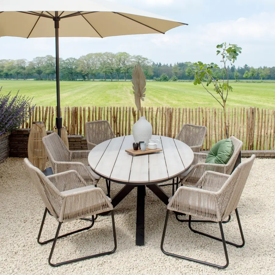 Kleur beïnvloedt de uitstraling van je tuin. Neutrale tinten zorgen voor rust en laten zich eenvoudig combineren met andere tuinmeubelen en accessoires. Wie binnen al een duidelijk kleurenpalet heeft, kan dat doorzetten naar buiten voor een samenhangend geheel. Binnen het assortiment vind je tuinsets in kleuren die passen bij zowel moderne en Japandi tuinstijlen als landelijke of organische tuinen. Elke tuin heeft een eigen karakter. De stijl van je tuinset moet daarbij aansluiten. Wicker tuinsets passen goed in groene, landelijke tuinen en zorgen voor een warme uitstraling. Aluminium tuinsets sluiten juist aan bij moderne tuinen met strakke lijnen en weinig onderhoud. Ronde en ovale tafels brengen rust en werken praktisch in kleinere ruimtes. Door te kiezen voor een rustige basis kun je met accessoires en kussens eenvoudig variëren per seizoen.