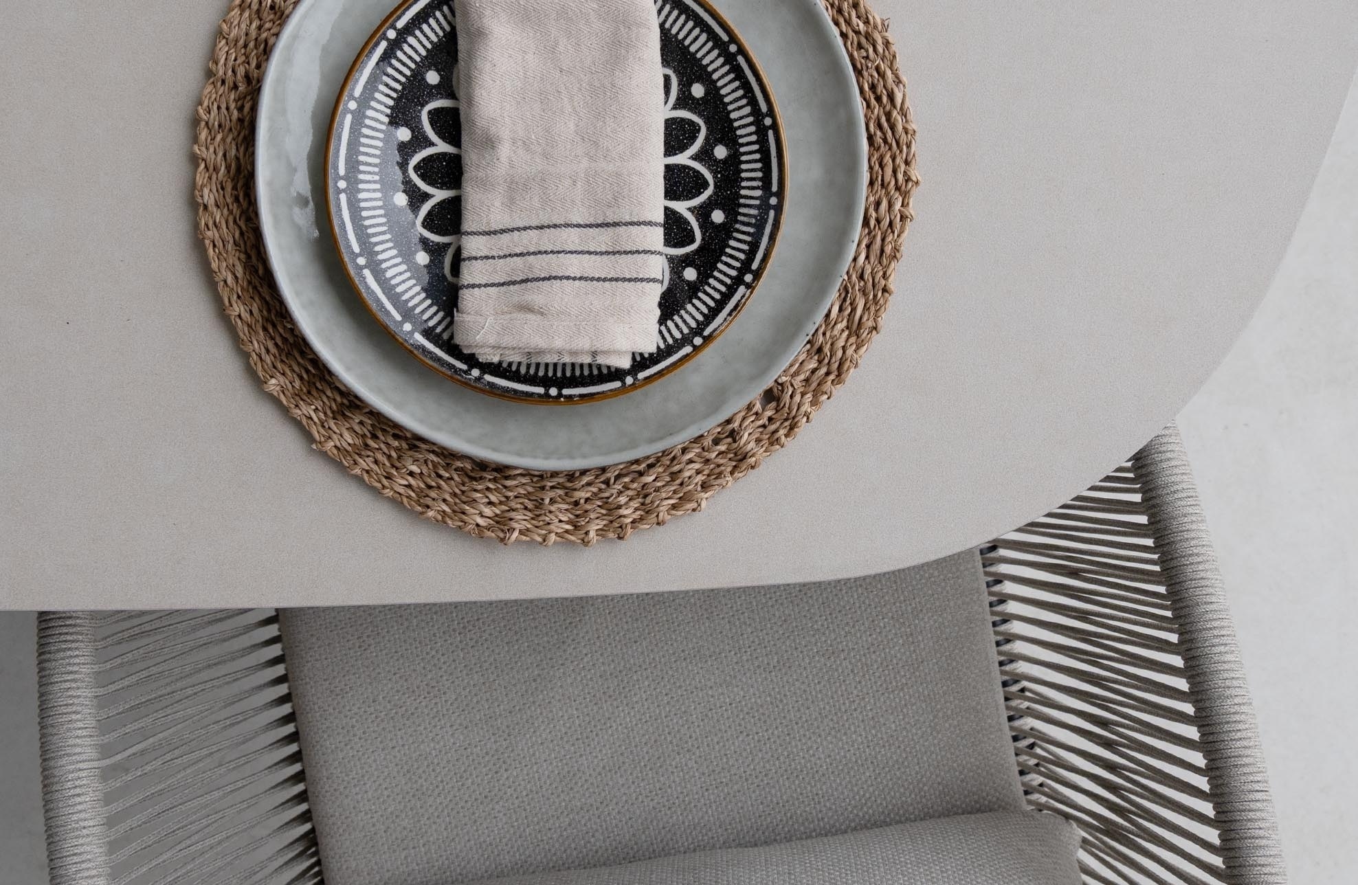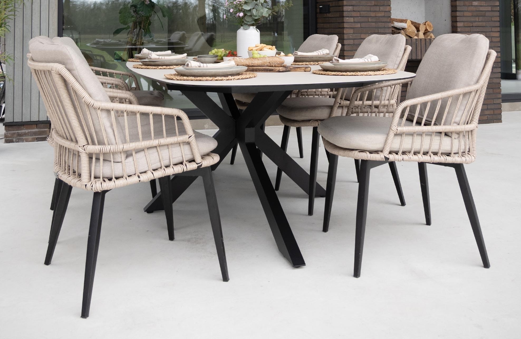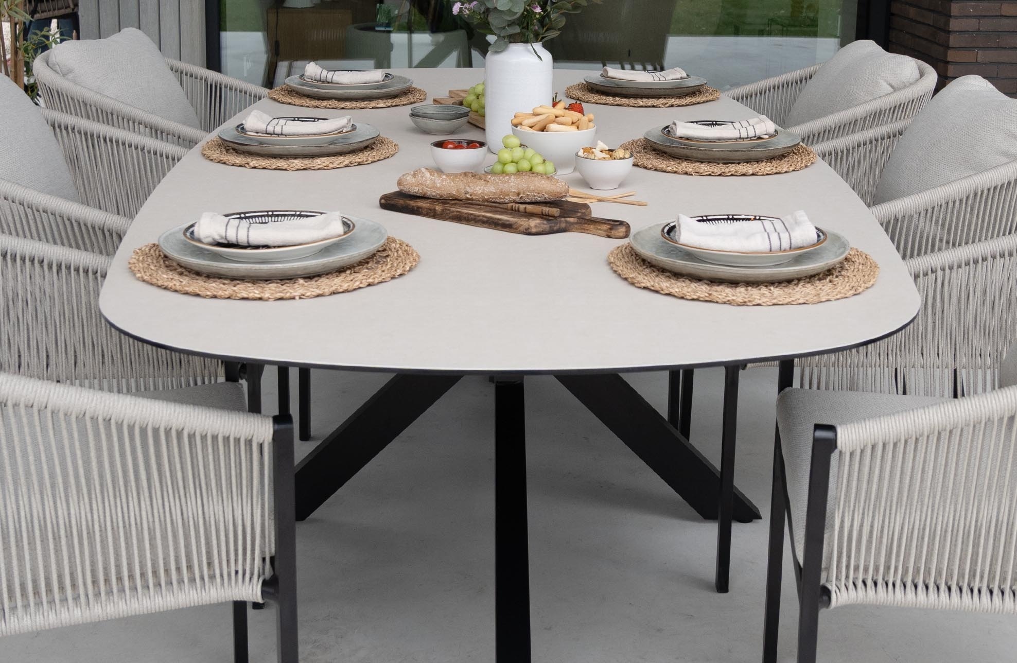 De Malaga tuintafel is niet alleen prachtig vormgegeven met haar keramische Ceramic Brono blad, maar heeft ook een bijzonder functionele eigenschap: de spinpoot. Deze unieke onderstelstructuur in zwart aluminium biedt een aantal praktische voordelen. Doordat de poten zich in een spinvorm naar buiten uitstrekken, ontstaat er extra beenruimte rondom de tafel. Dit maakt de Malaga tafel ideaal voor grote gezelschappen, omdat iedereen comfortabel aan kan schuiven zonder last te hebben van tafelpootbelemmeringen. De spinpoot zorgt daarnaast voor optimale stabiliteit van de tafel, zelfs bij grotere afmetingen. Hierdoor blijft de tafel stevig staan, ongeacht de ondergrond, en draagt bij aan een modern en luchtig design.