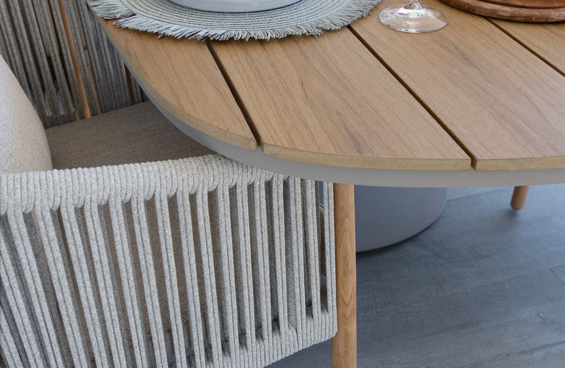 Maak kennis met onze nieuwe Tower tuintafel in een unieke bootvorm. Deze prachtige tafel biedt een stijlvolle en moderne look die perfect past in diverse buitenomgevingen, van gezellige familietuinen tot zakelijke terrassen. Het blad, met een lengte van maar liefst 260 cm, is vervaardigd uit Tecon Teak, een hoogwaardig materiaal dat de warme uitstraling van echt teakhout combineert met het onderhoudsgemak van polywood. Hierdoor behoudt de tafel zijn elegante en natuurlijke look zonder het intensieve onderhoud dat echt hout vereist.